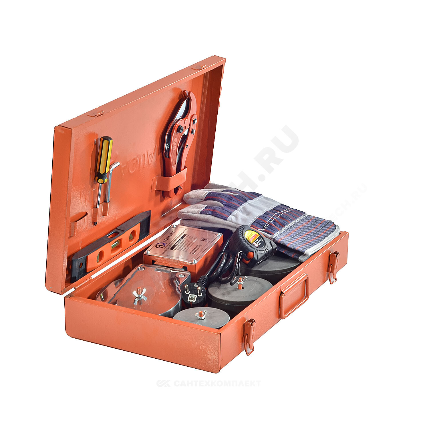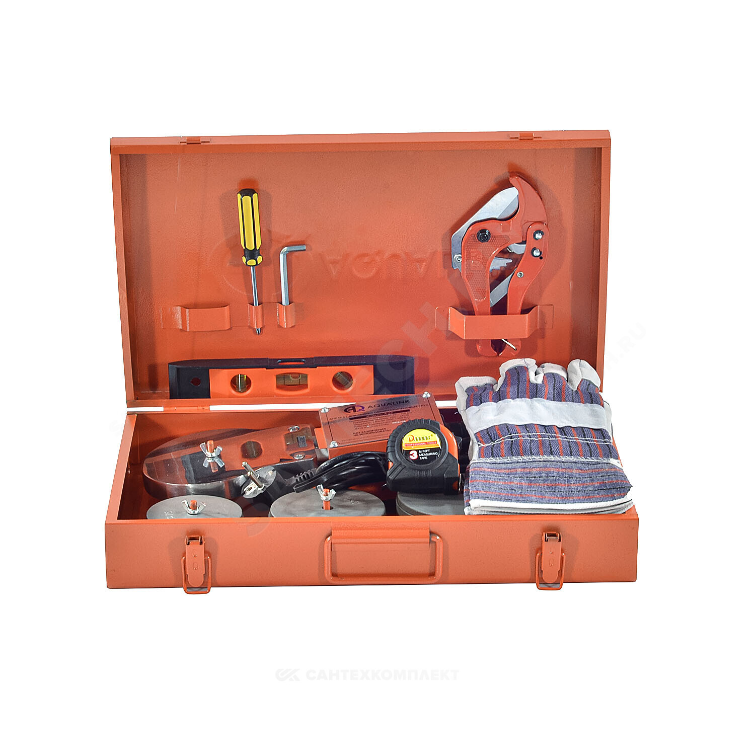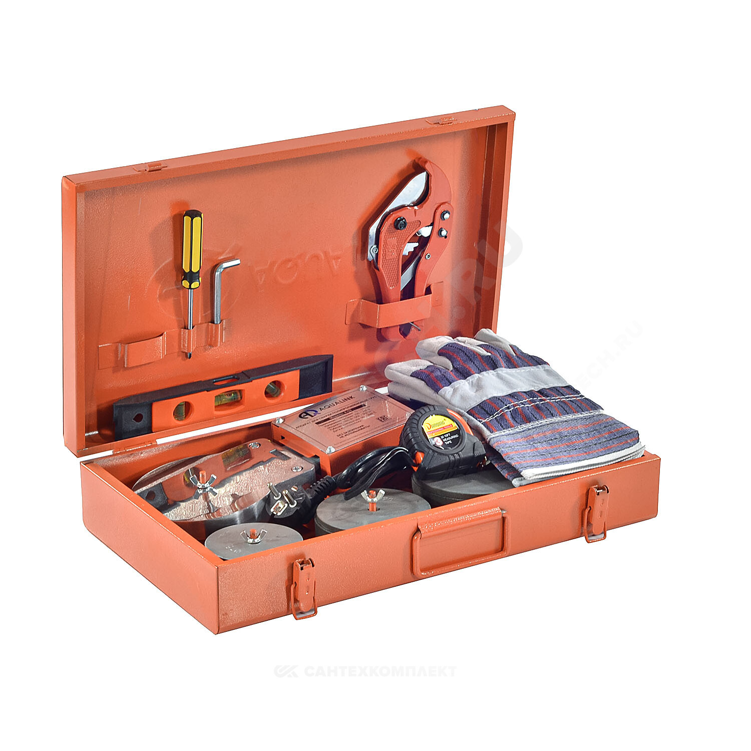 Сварочный аппарат -1 шт; насадки на сварочный аппарат – 75 мм, 90 мм, 110 мм; ключ шестигранный внутренний 5 мм – 1 шт; подставка – 1шт; ножницы – 1шт; рулетка – 1 шт; уровень – 1шт; перчатки – 1 пара; стальной чемодан – 1шт