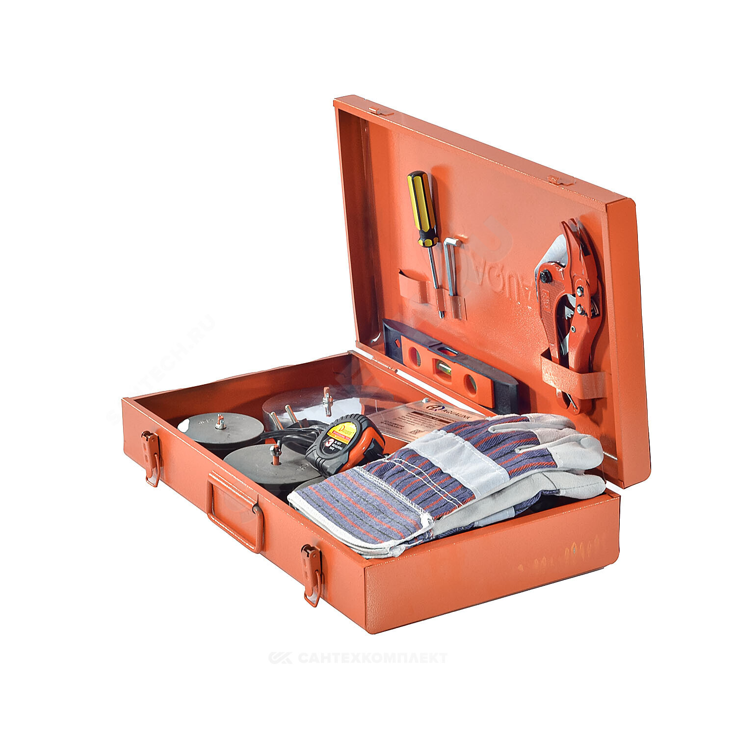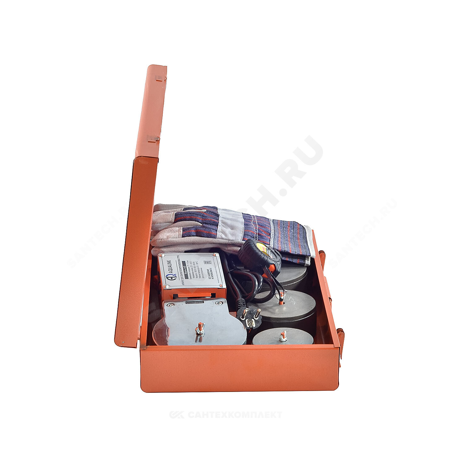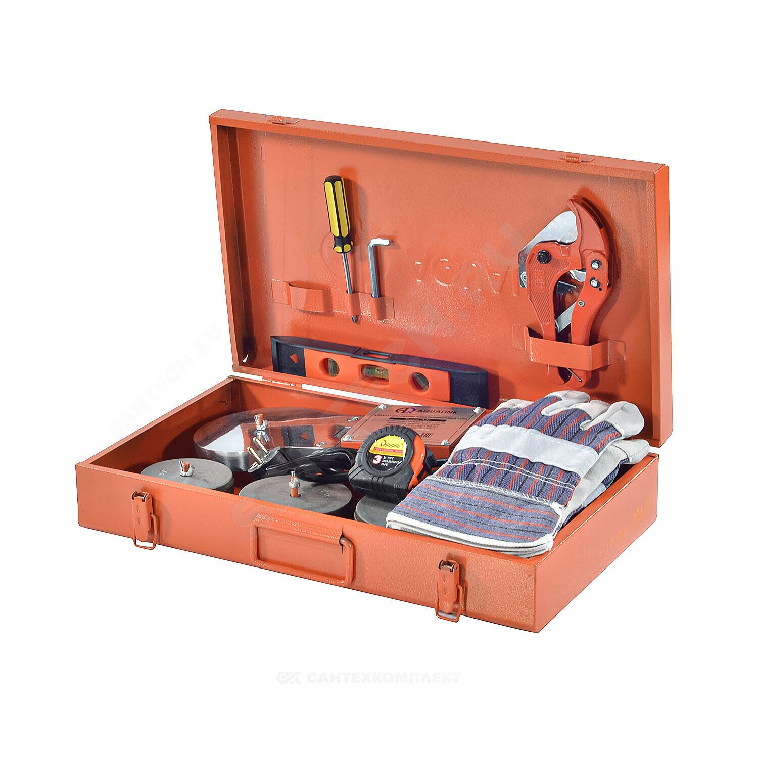 Сварочный аппарат -1 шт; насадки на сварочный аппарат – 75 мм, 90 мм, 110 мм; ключ шестигранный внутренний 5 мм – 1 шт; подставка – 1шт; ножницы – 1шт; рулетка – 1 шт; уровень – 1шт; перчатки – 1 пара; стальной чемодан – 1шт