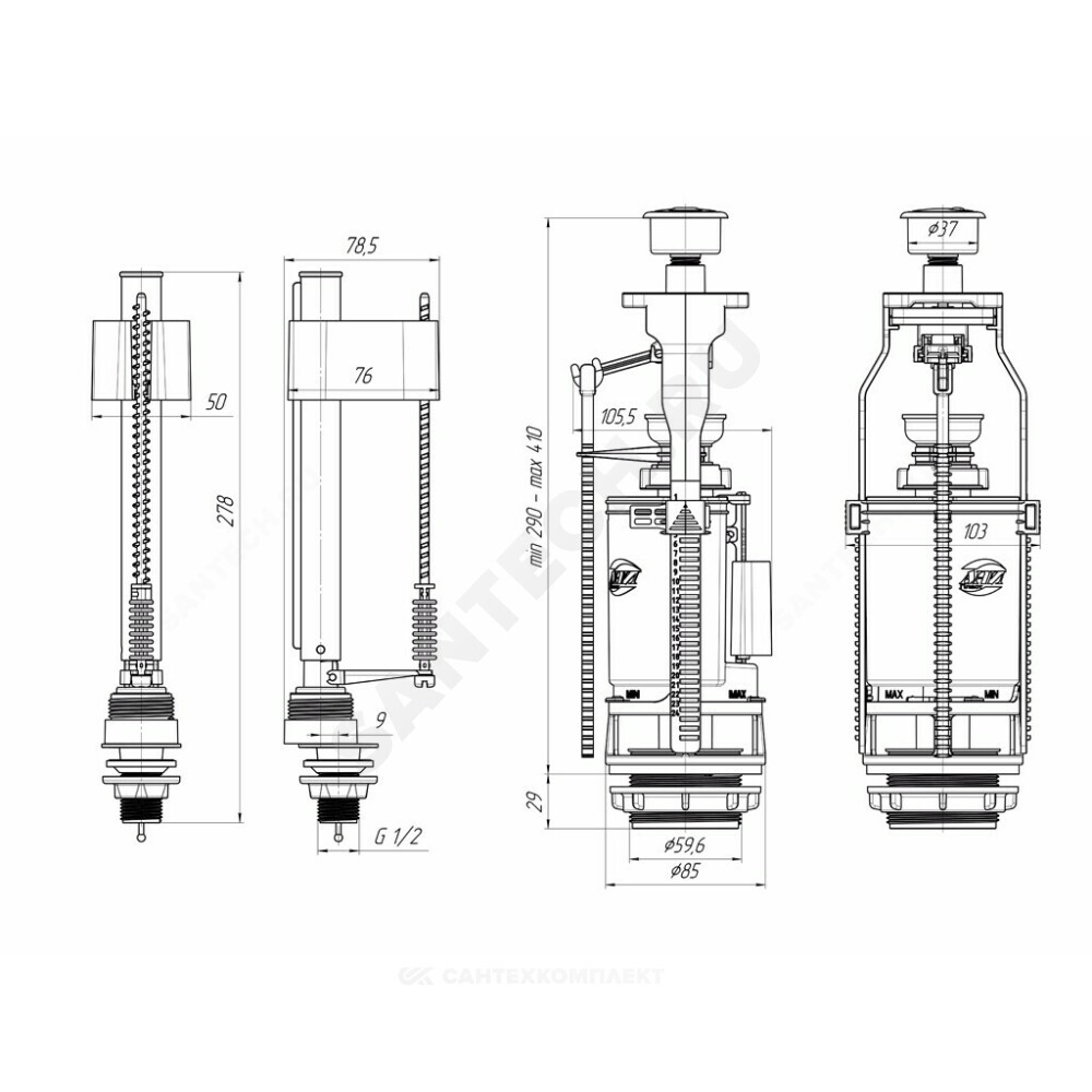 Наливной механизм с нижней подводкой и пластиковой резьбой диаметром 1/2, Сливной механизм металлизированная кнопка с двойным режимом слива эконом