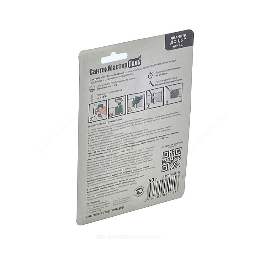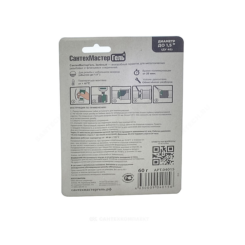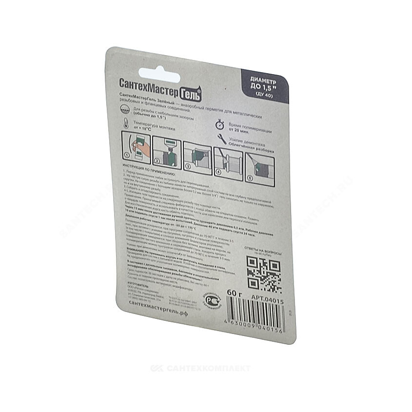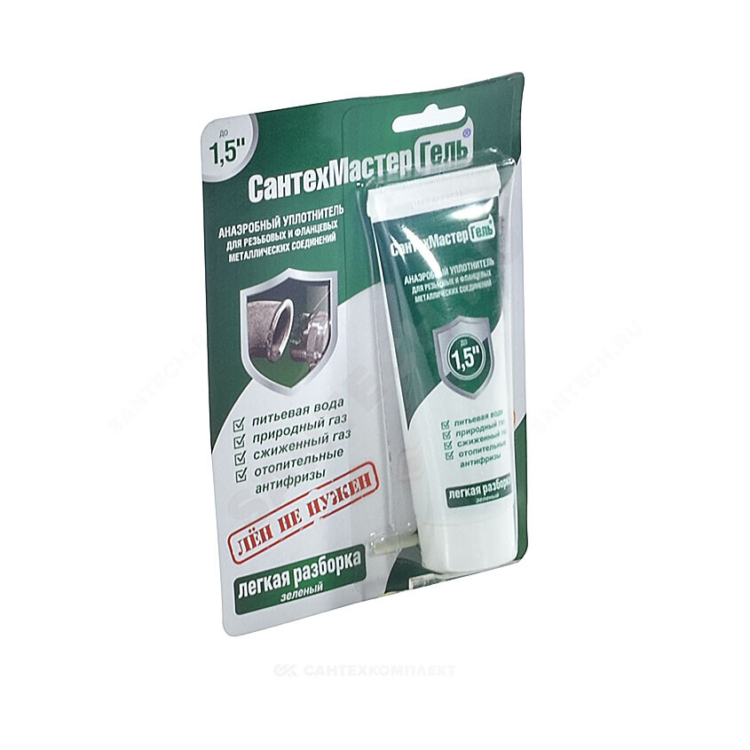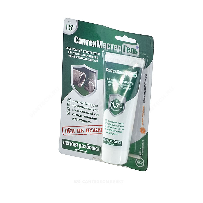 СантехМастер Гель Зелёный — это резьбовой герметик для сантехники, созданный для легкого демонтажа соединений, которые располагаются в тяжело доступных местах, где невозможно использовать иные уплотнительные материалы. Он разработан для быстрой и качественной герметизации металлических фланцевых и резьбовых соединений. Данный гель-герметик разработан для труб диаметром до 1 1/2" (Ду 40). Соединение, собранное с использованием Зелёного Геля поддается легкому демонтажу без применения нагрева. Поляризуется в считанные минуты после затяжки резьбы, без необходимости в каких-то особенных условиях температуры окружающей среды или доступа к кислороду.