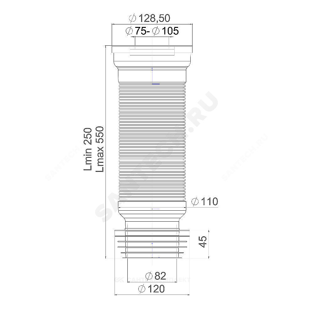 Гофра для унитаза армированная 110мм L=550мм для чугунных и пластиковых труб Unicorn T550
