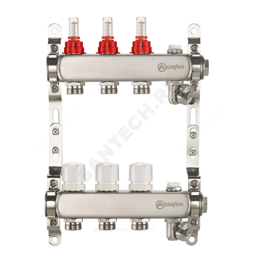 подающий коллектор: с расходомерами,заглушкой, обратный коллектор: с термостатическими клапанами, заглушкой