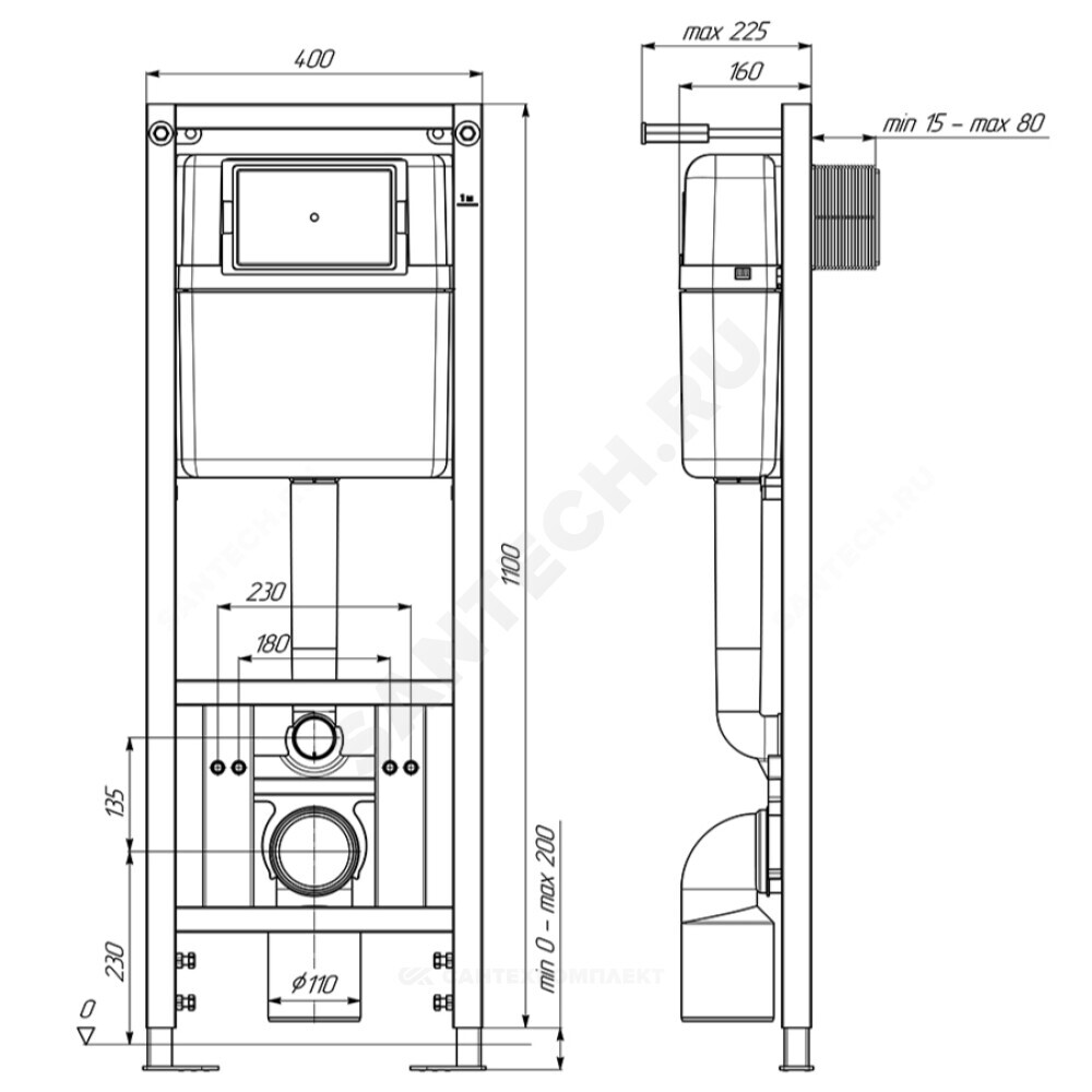 металлическая рама с нижними и верхними крепёжными элементами; комплект крепления инсталляции; заглушка для трубы 50 мм; заглушка для трубы 110 мм;кнопка смыва; картонный короб паспорт с инструкцией по монтажу и эксплуатации.