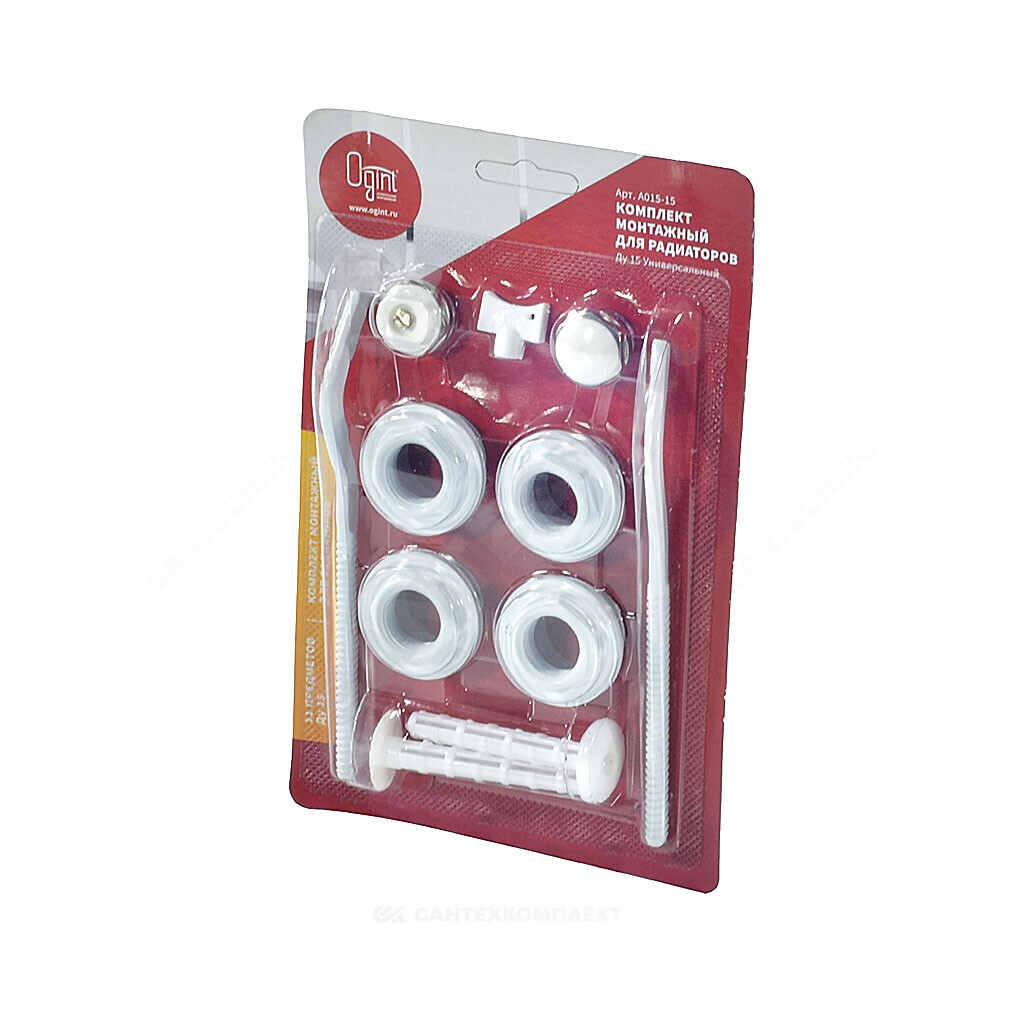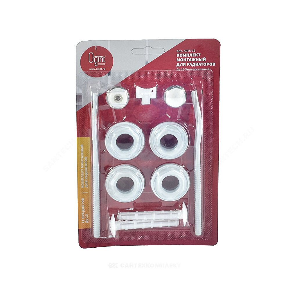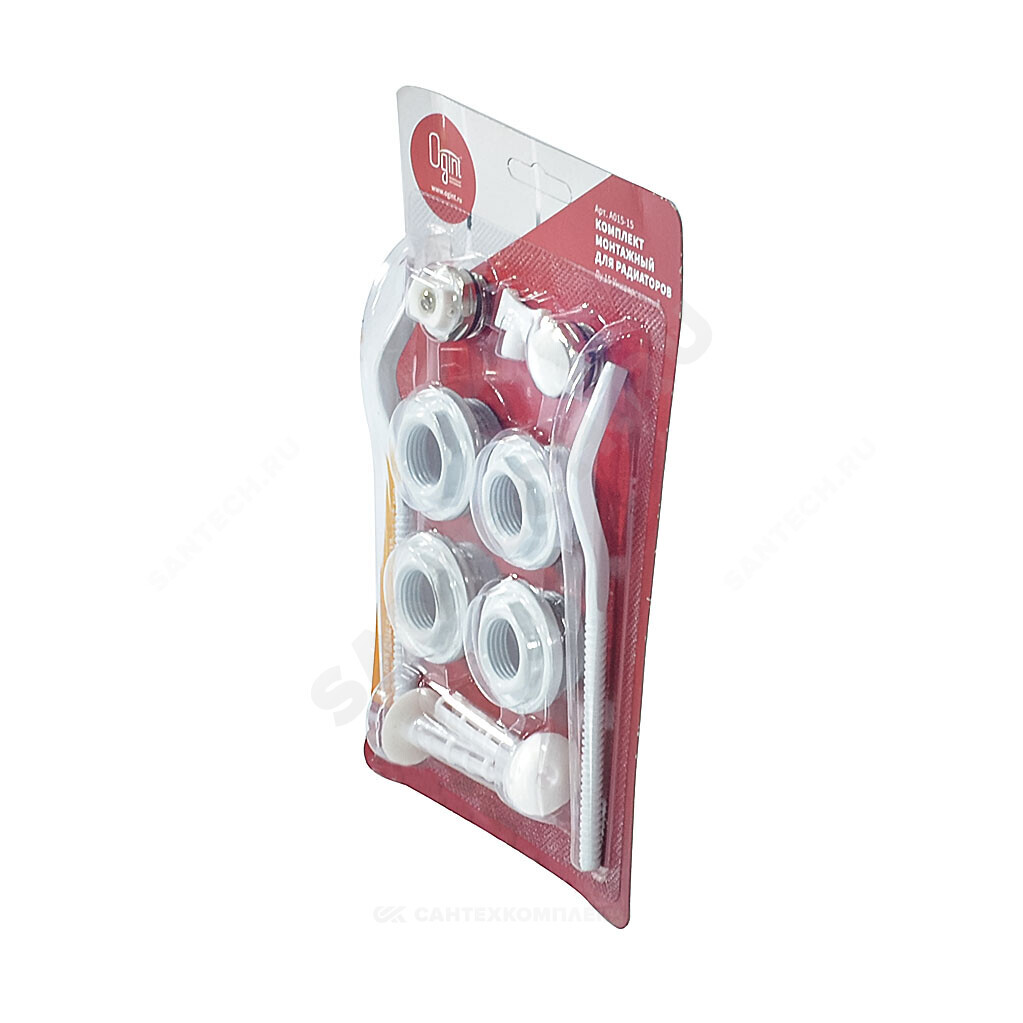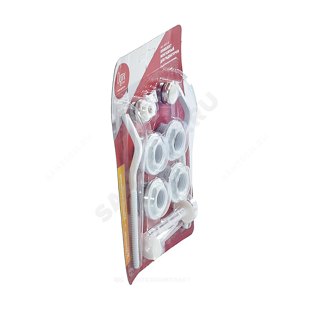Комплект в сборе (пробка проходная 1"x1/2" левая - 2 шт., пробка проходная 1"x1/2" правая - 2 шт., заглушка 1/2" - 1 шт., кран Маевского 1/2" - 1 шт., ключ для крана Маевского - 1 шт., кронштейн настенный штыревой плоский - 2 шт., дюбель - 2 шт.)
