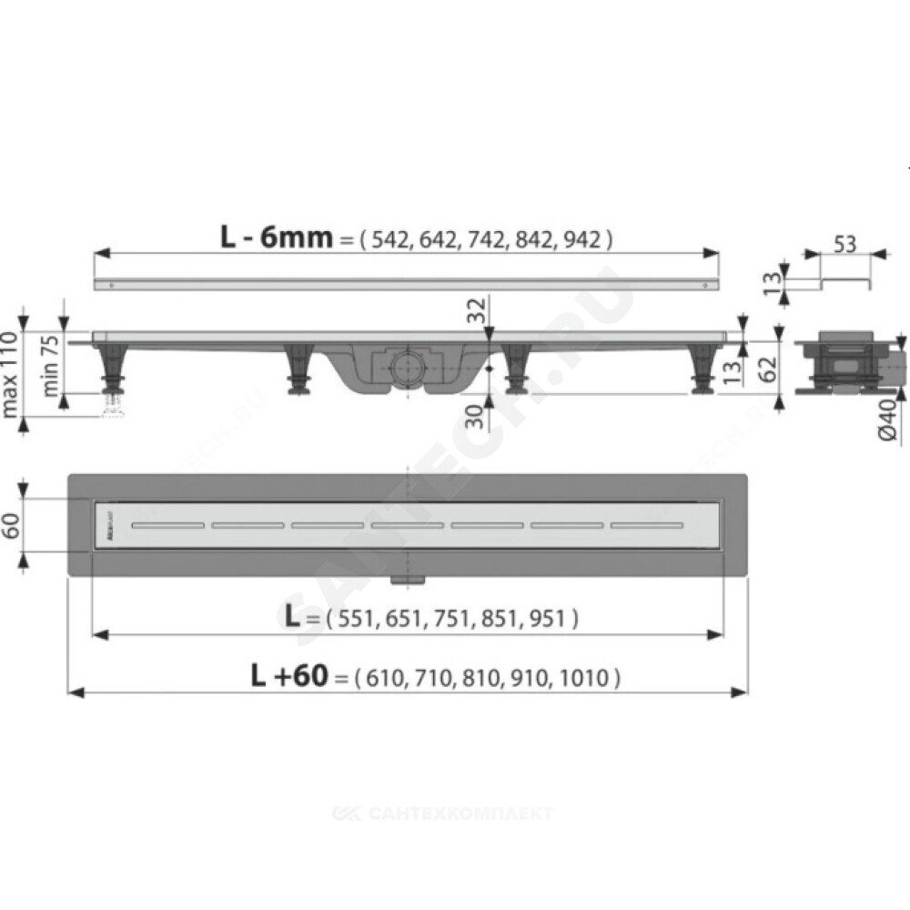 Водоотводящий желоб Самоклеящиеся гидроизоляционные ленты Крюк для демонтажа Перфорированная решетка из нержавеющей стали Simple 8 матового цвета в охранной пленке Гидрозатвор – комбинированный SMART Регулируемые по высоте ножки - 4 шт. Монтажный комплект: шуруп 4,2х38 - 8 шт., дюбель D=8 мм - 8 шт.
