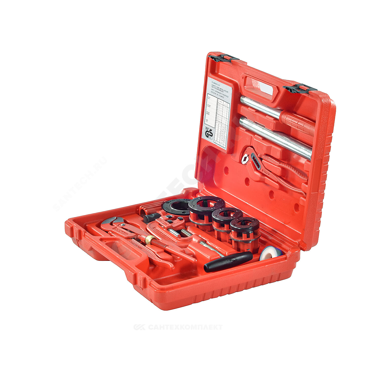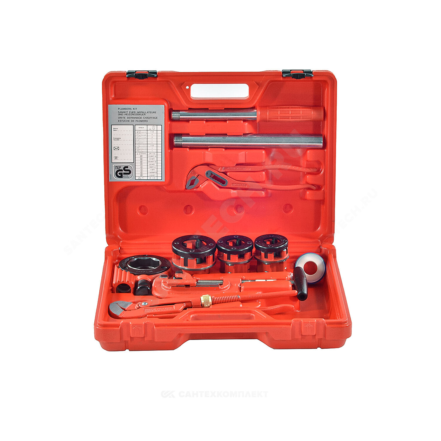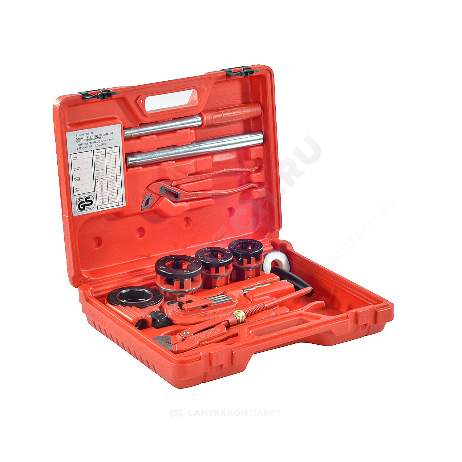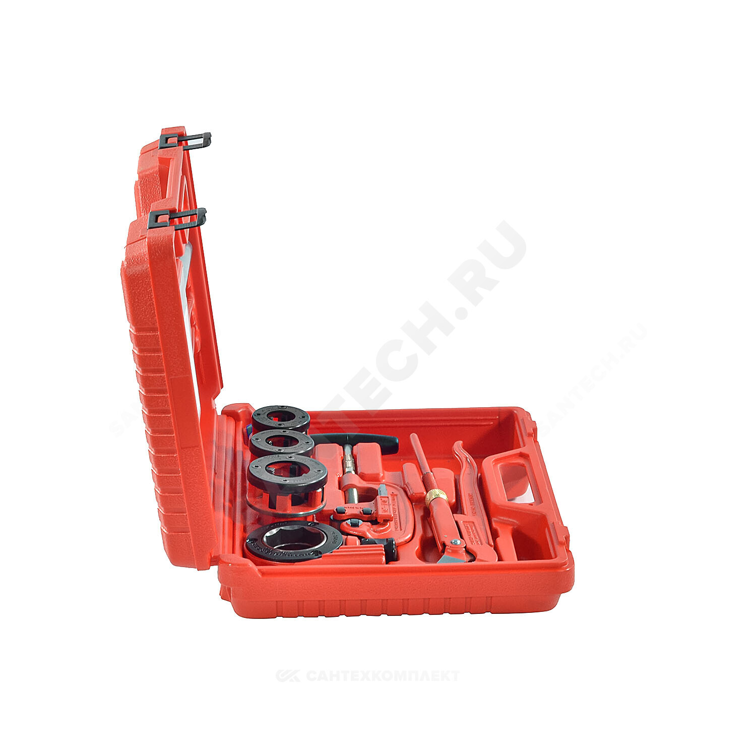 Резьбонарезной клупп с трещоткой 1 1/4" SUPER CUT, головки BSPT R 1/2", R 3/4", 1", труборез для стальных труб SUPER 1 1/4", клещи тип SP 10",газовый ключ 1", фумлента, пластмассовый чемодан.