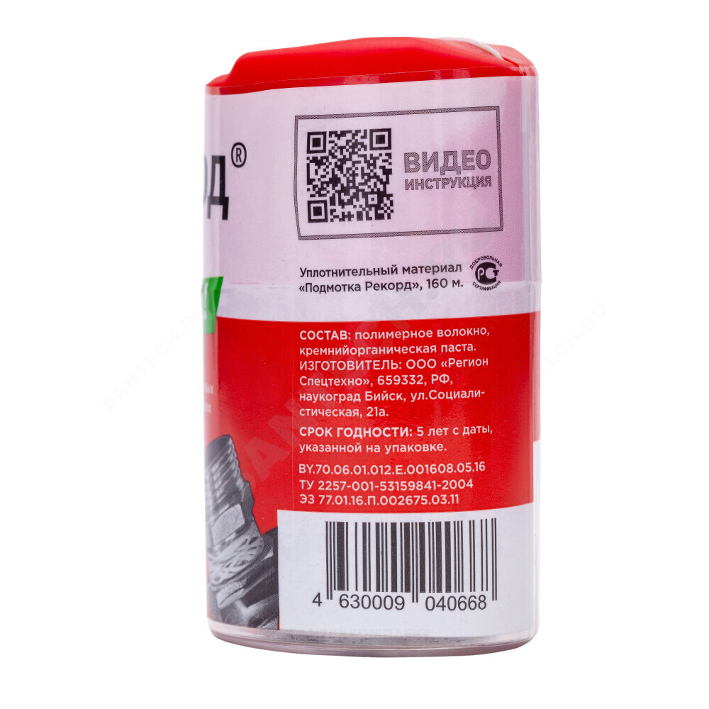 Подмотка Рекорд — это полимерная нить, пропитанная специальным герметизирующим составом — уплотнительный материал последнего поколения, который обеспечивает надежное уплотнение и защищает соединение от коррозии. Подмотка Рекорд является универсальной нитью для герметизации резьбовых соединений и применяется в работе с природным и сжиженным газом, холодной и горячей водой, питьевой водой и со сжатым воздухом и защищает соединение от протечек на 20 лет. Она не разлагается, не разбухает и не засоряет трубопроводы и фильтра. Этот уплотнительный материал герметизирует резьбовые соединения мгновенно, выдерживает даже самые сильные вибрации и не разрушается при температурных перепадах от -60 ДО +120 ºC.
