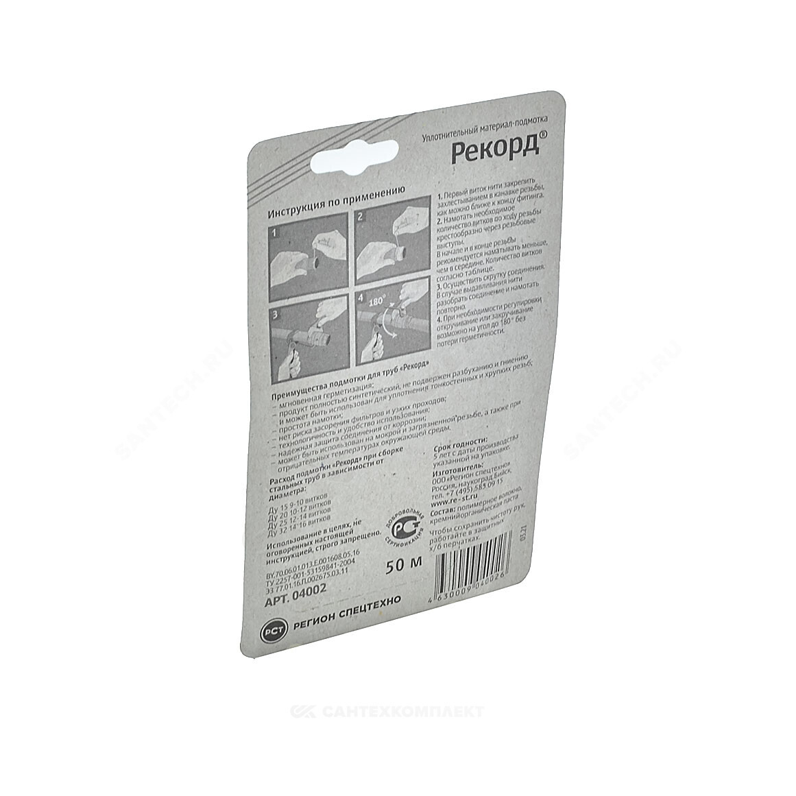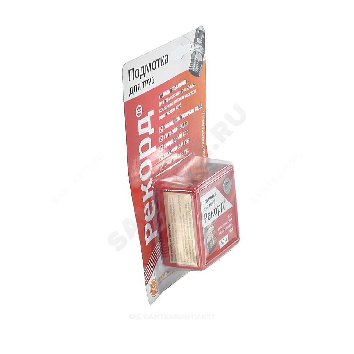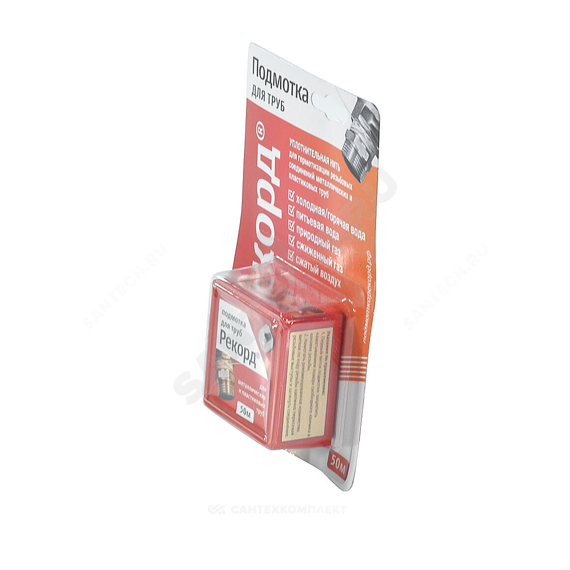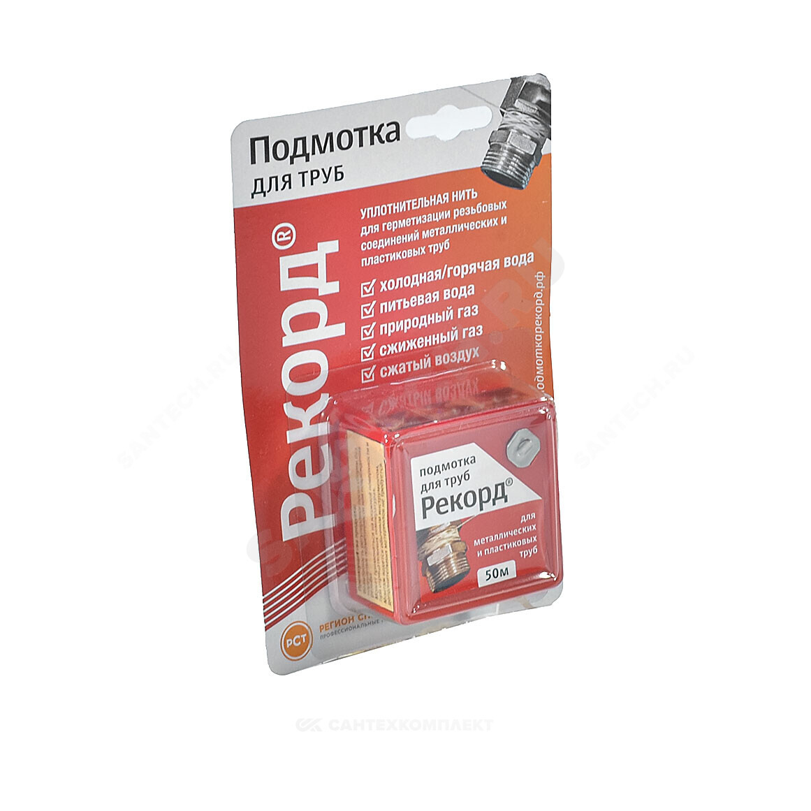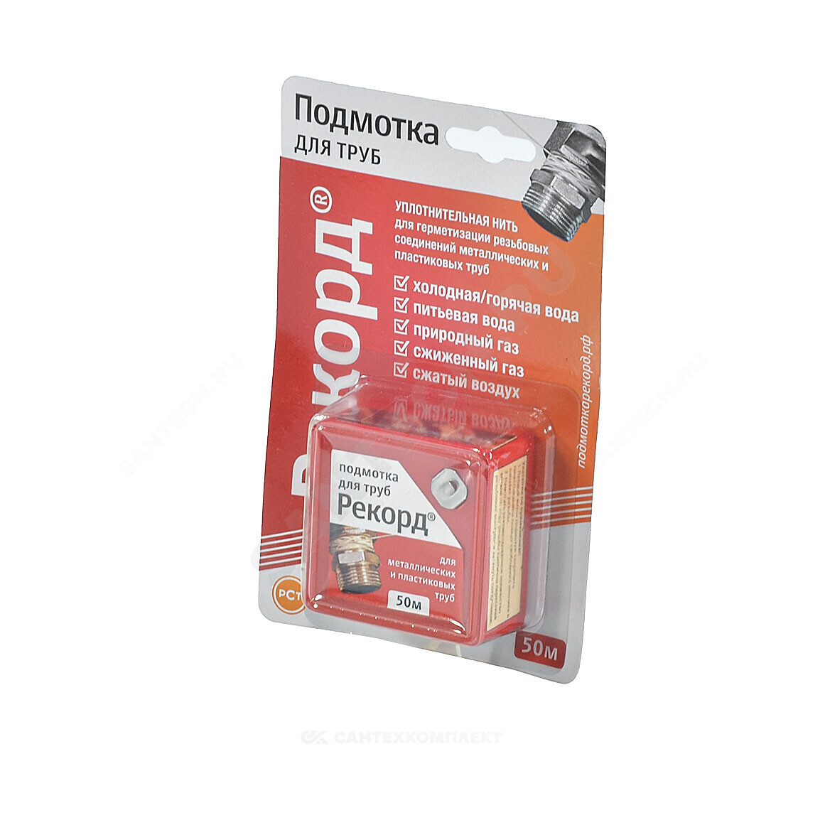 Подмотка Рекорд — это полимерная нить, пропитанная специальным герметизирующим составом — уплотнительный материал последнего поколения, который обеспечивает надежное уплотнение и защищает соединение от коррозии. Подмотка Рекорд является универсальной нитью для герметизации резьбовых соединений и применяется в работе с природным и сжиженным газом, холодной и горячей водой, питьевой водой и со сжатым воздухом и защищает соединение от протечек на 20 лет. Она не разлагается, не разбухает и не засоряет трубопроводы и фильтра. Этот уплотнительный материал герметизирует резьбовые соединения мгновенно, выдерживает даже самые сильные вибрации и не разрушается при температурных перепадах от -60 ДО +120 ºC.