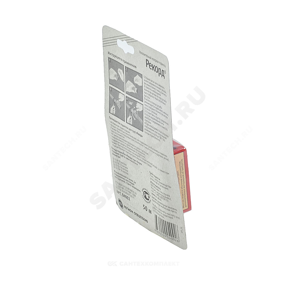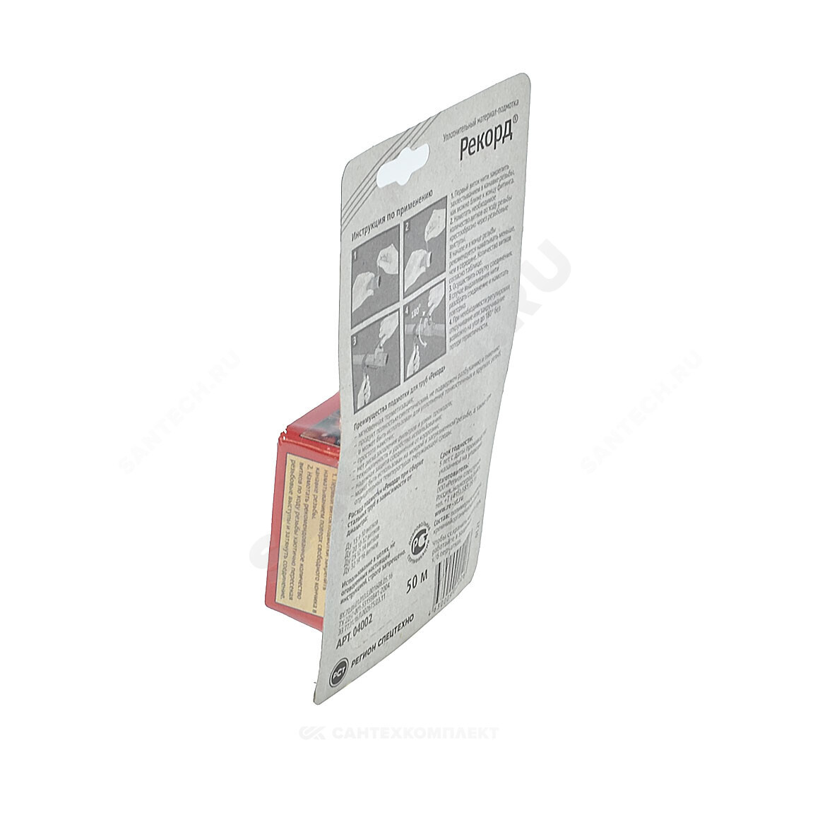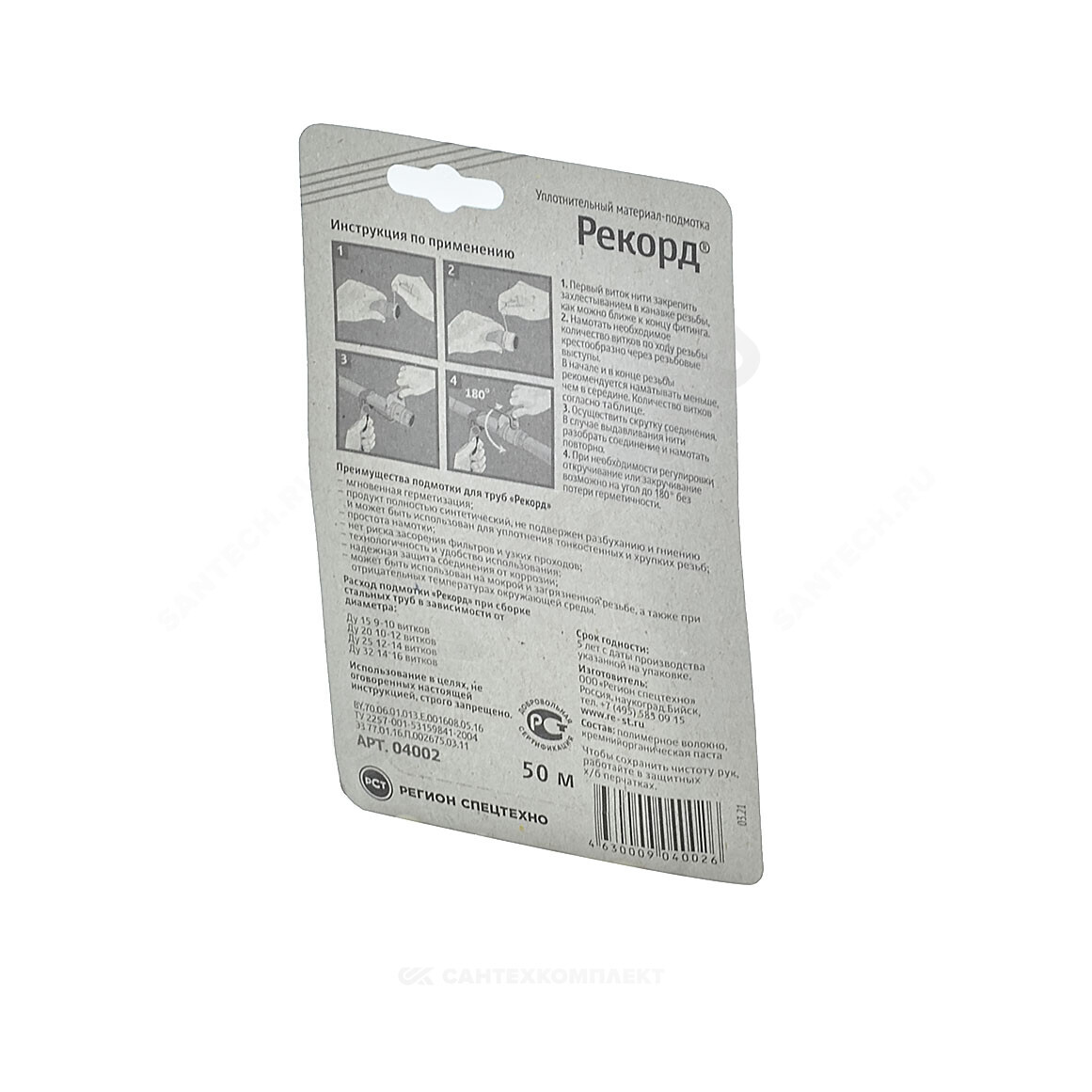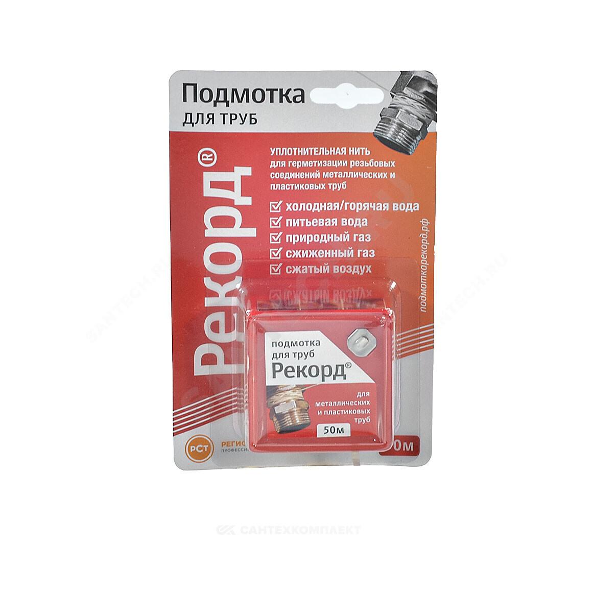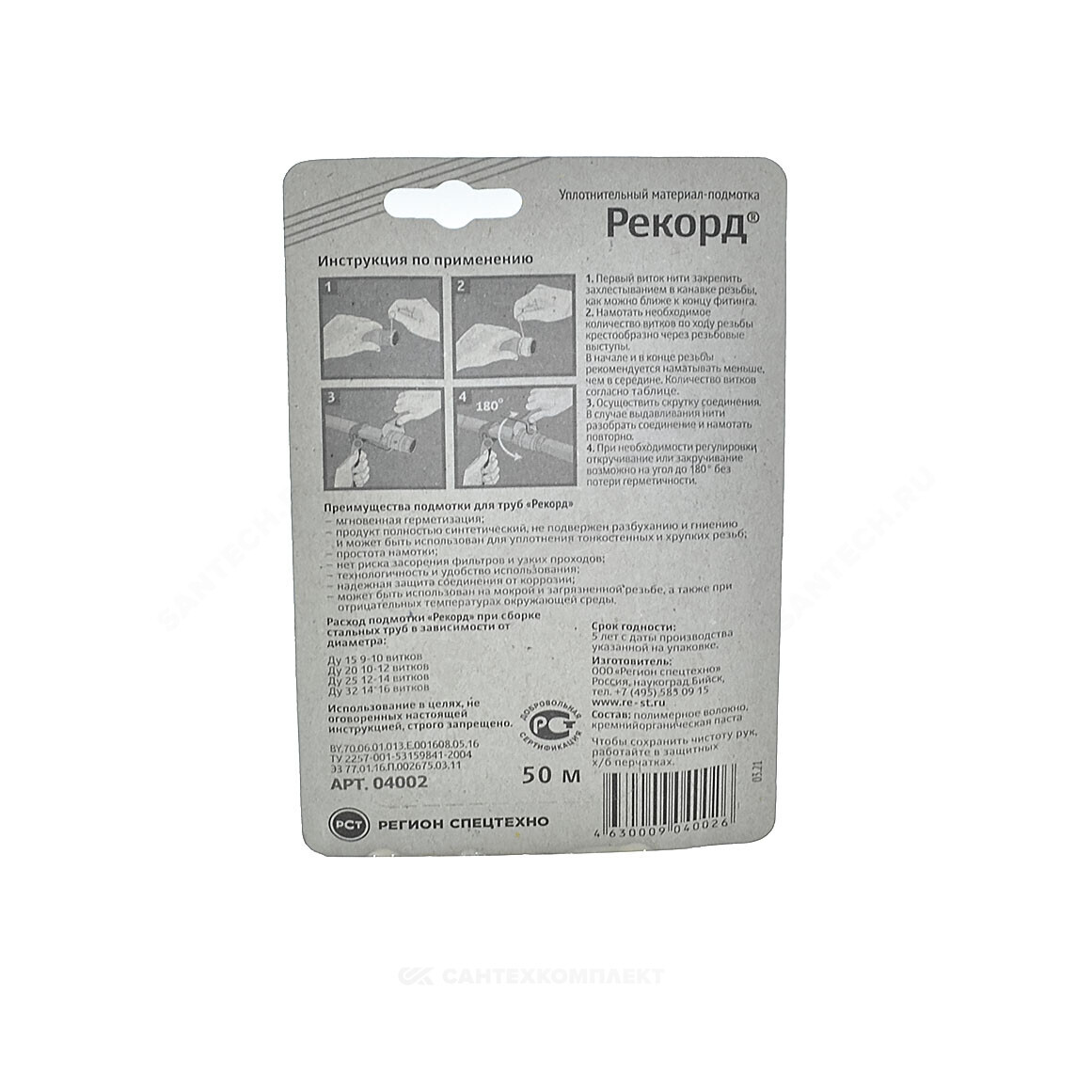 Подмотка Рекорд — это полимерная нить, пропитанная специальным герметизирующим составом — уплотнительный материал последнего поколения, который обеспечивает надежное уплотнение и защищает соединение от коррозии. Подмотка Рекорд является универсальной нитью для герметизации резьбовых соединений и применяется в работе с природным и сжиженным газом, холодной и горячей водой, питьевой водой и со сжатым воздухом и защищает соединение от протечек на 20 лет. Она не разлагается, не разбухает и не засоряет трубопроводы и фильтра. Этот уплотнительный материал герметизирует резьбовые соединения мгновенно, выдерживает даже самые сильные вибрации и не разрушается при температурных перепадах от -60 ДО +120 ºC.