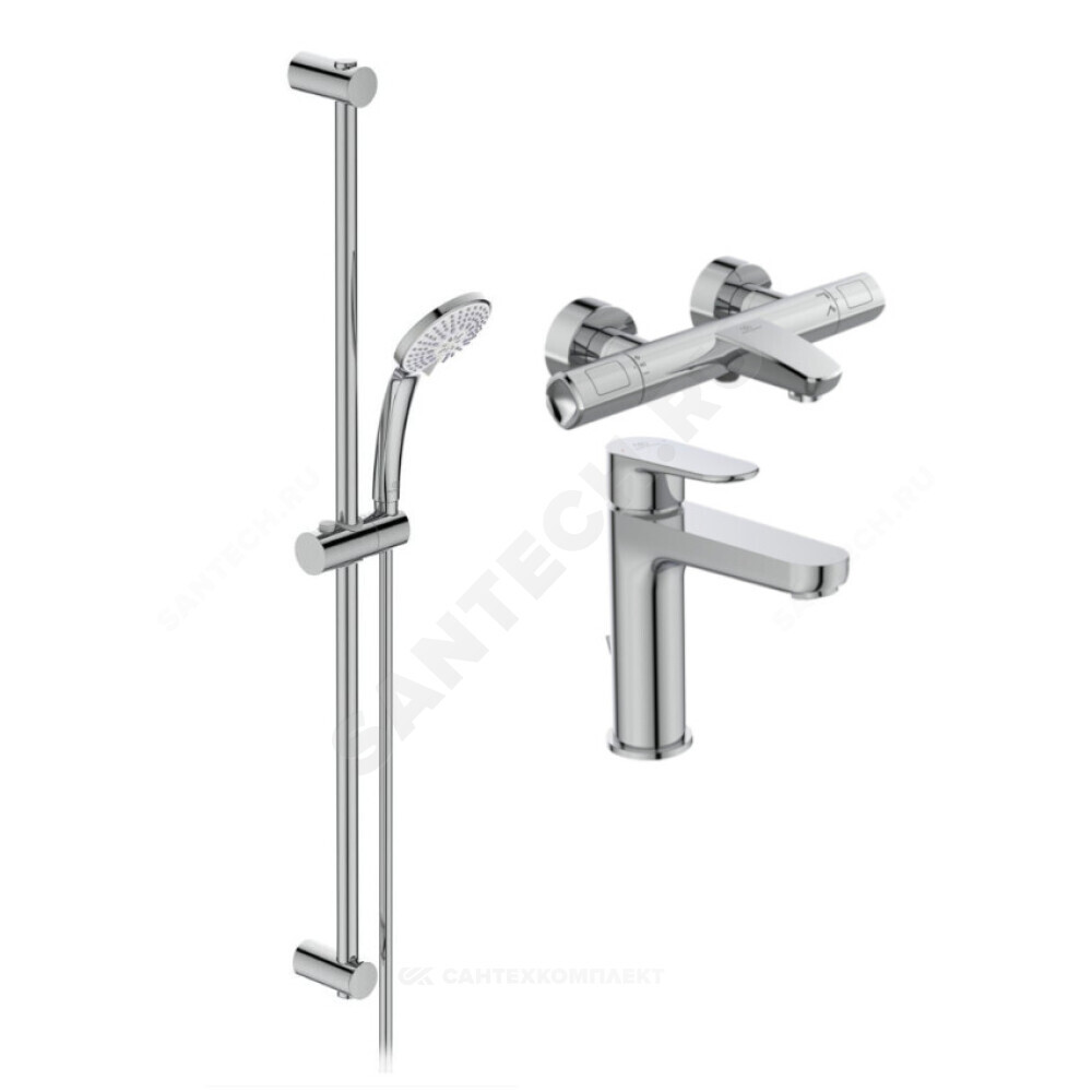 CERATHERM T100 промо комплект, состоящий из: A7238AA Ceratherm T100 Настенный термостатический смеситель для ванны/душа, скрытый монтаж на эксцентриках термостатический картридж IS, новая технология, затворы на керамических дисках G1/2 180гр технология "Cool body" ("Холодный корпус") металлические рукоятки с ограничителями температуры (40oC) и потока воды (50%) встроенный обратный клапан переключатель интегрирован в корпус аэратор Perlator BC699AA CERAFINE O Однорычажный смеситель для раковины с металлическим донным клапаном система облегченного монтажа EasyFix литой излив, длина излива 126 мм, высота 118 мм аэратор Perlator с ограничением потока 5 л/мин керамический картридж 28 мм FirmaFlow, с функцией HWTC (ограничение максимальной температуры горячей воды) металлическая рукоятка гибкая подводка G3/8" BC797AA IDEALRAIN Душевой гарнитур, состоящий из 3-функ.лейки 100мм штанги 900 мм шланга Idealflex 1600мм