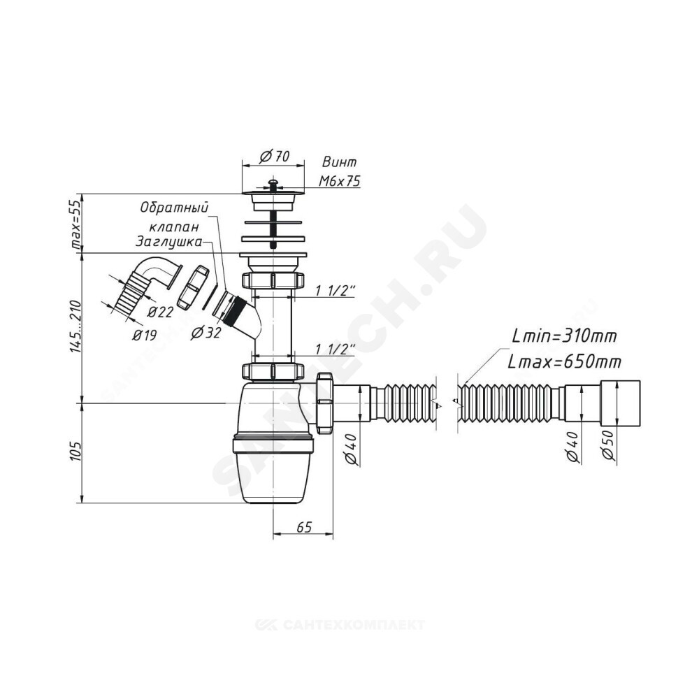 корпус - 1; патрубок с отводом - 1; горловина - 1; гайка - 4; болт 75мм - 1; решетка - 1; прокладка горловины - 1; прокладка решетки - 1; прокладка коническая - 2; прокладка торцевая - 1; прокладка с гидрозатвором - 1; заглушка - 1; гибкая труба - 1
