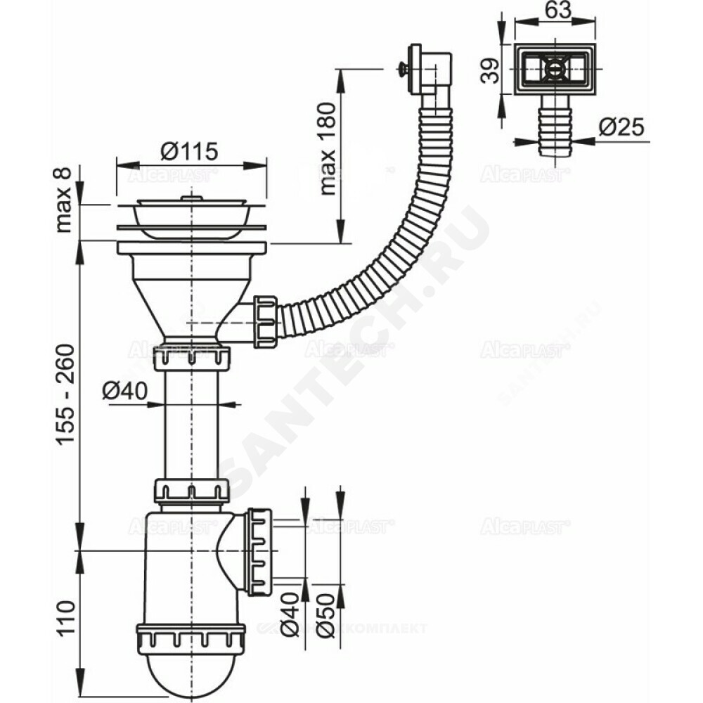 Корпус сифона с системой перелива Пробка из нержавеющей стали Сливная решетка из нержавеющей стали