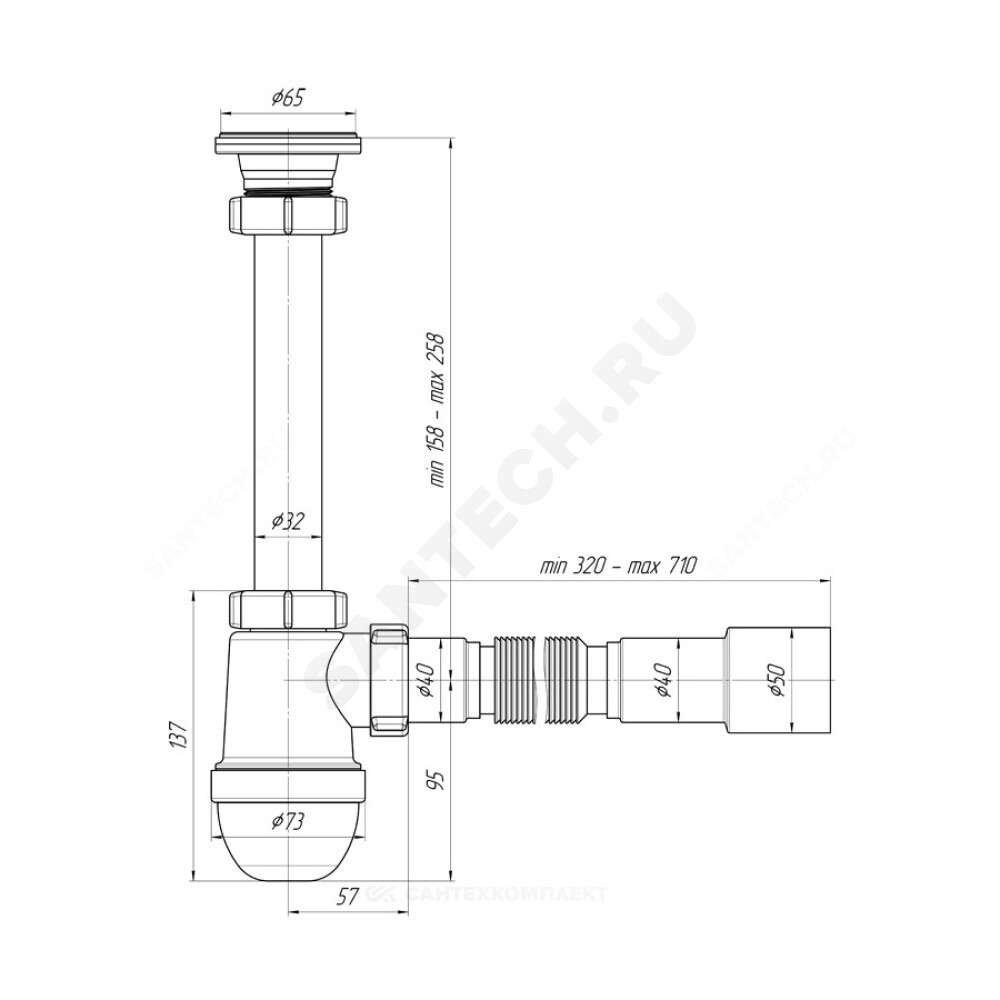 Сифон, выпуск с нержавеющей сеткой (под перелив), гофроподвод 1 1/2"х40/50