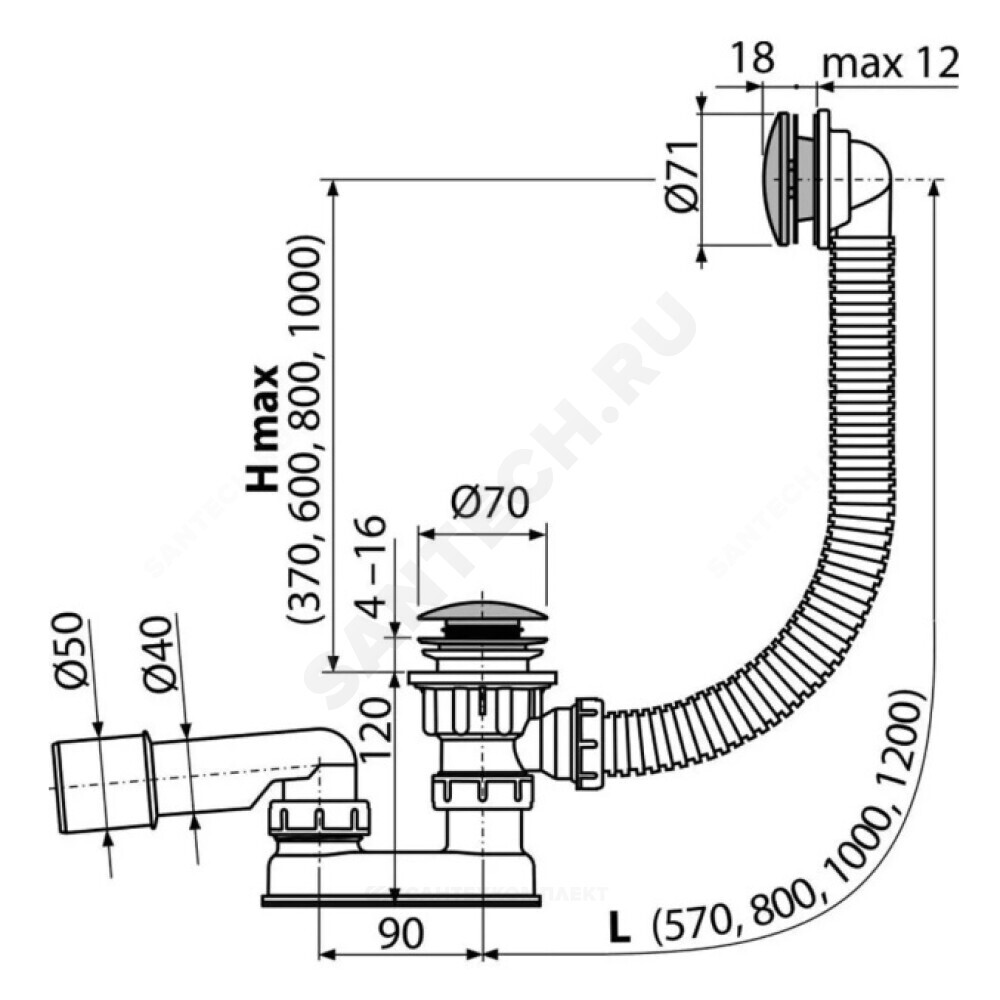 Корпус сифона с системой перелива Хромированная металлическая решетка слива и накладка перелива Хромированная стальная пробка Хромированный латунный донный клапан Гидрозатвор сифона из полипропилена, сваренный ультразвуковым методом, устойчив к термическим и химическим воздействиям Монтажный комплект Профильное уплотнение