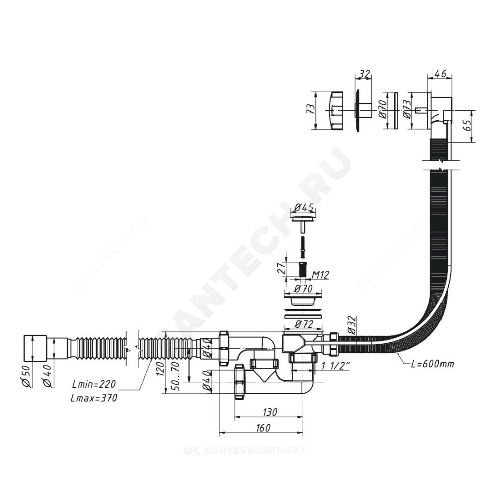 Выход для подключения к канализации, мм
