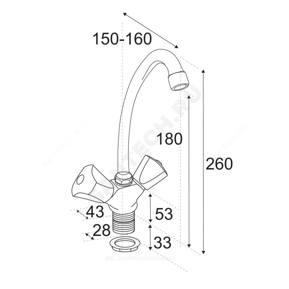 Смеситель для умывальника и мойки двухрукояточный центральный набортный