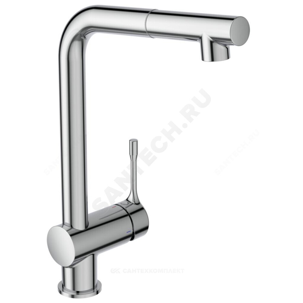 CERALOOK Однорычажный смеситель для кухонной мойки с высоким поворотным выдвижным изливом (длина излива 207 мм, высота 313 мм), угол поворота 360гр, рукоятка сбоку керамический картридж 38 мм Firmaflow с функцией HWTC (ограничение максимальной температуры горячей воды), с функцией CLICK (ограничение потока воды) гибкая подводка G3/8" (антибактериальные шланги PEX) монтаж IS-Fix - крепеж на центральной гайке M33x1,5 с двумя блокирующими винтами, с пластиковой опорной пластиной для более стабильного монтажа на мойке из нержавеющей стали аэратор Perlator металлическая рукоятка индикаторы горячей / холодной воды на корпусе