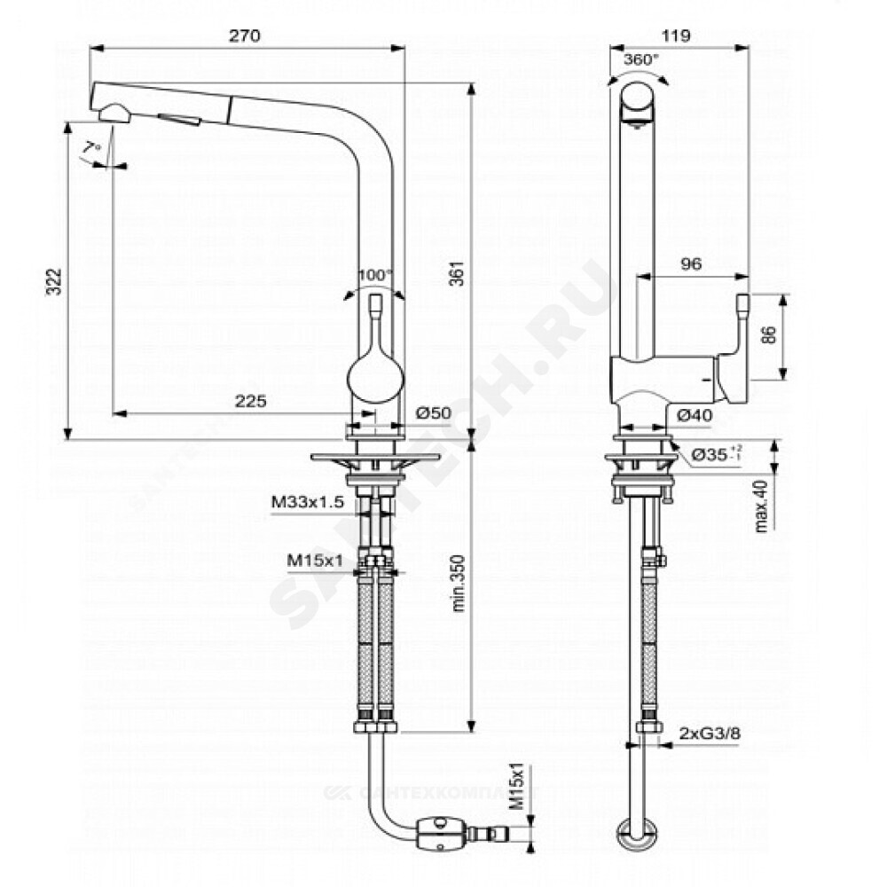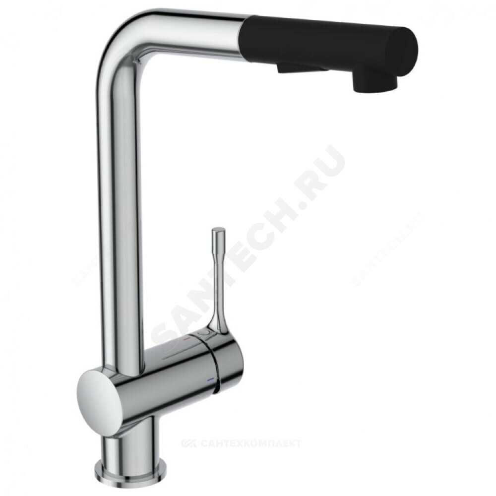 CERALOOK Однорычажный смеситель для кухонной мойки с высоким поворотным выдвижным изливом (длина 225 мм, высота 322 мм), угол поворота 360гр, рукоятка сбоку, 2-х функциональный душ керамический картридж 38 мм Firmaflow с функцией HWTC (ограничение максимальной температуры горячей воды), с функцией CLICK (ограничение потока воды) гибкая подводка G3/8" (антибактериальные шланги PEX) монтаж IS-Fix - крепеж на центральной гайке M33x1,5 с двумя блокирующими винтами, с пластиковой опорной пластиной для более стабильного монтажа на мойке из нержавеющей стали аэратор Perlator металлическая рукоятка, индикаторы горячей / холодной воды на корпусе