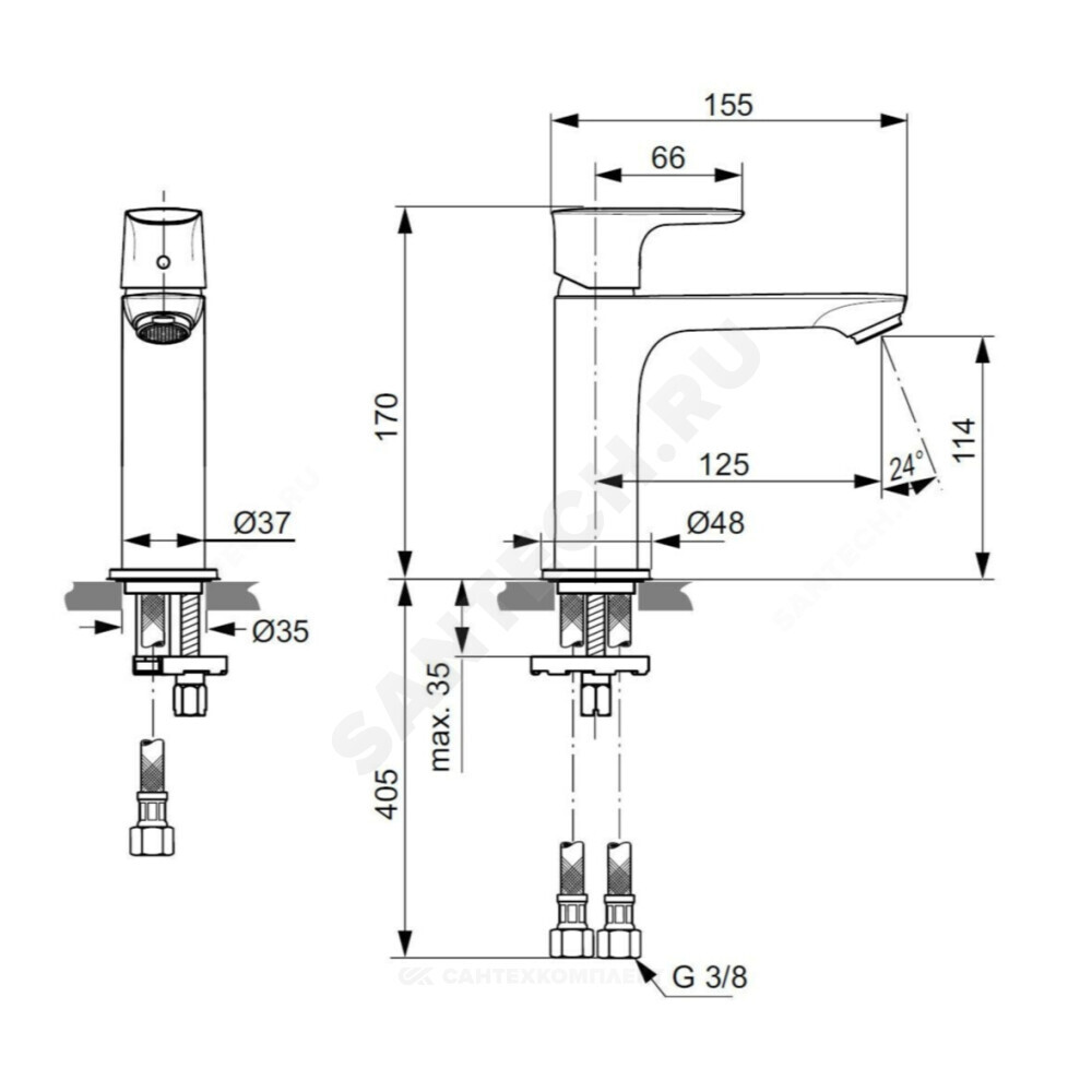 CONNECT AIR Grande Смеситель для раковины, тонкий корпус 36 мм система монтажа EASY-FIX (облегченный монтаж) аэратор Perlator M24x1 с ограничением потока 5 л/мин. керамический картридж 25 мм без функции HWTC, без функции CLICK гибкая подводка PEX G3/8" 400 мм без донного клапана