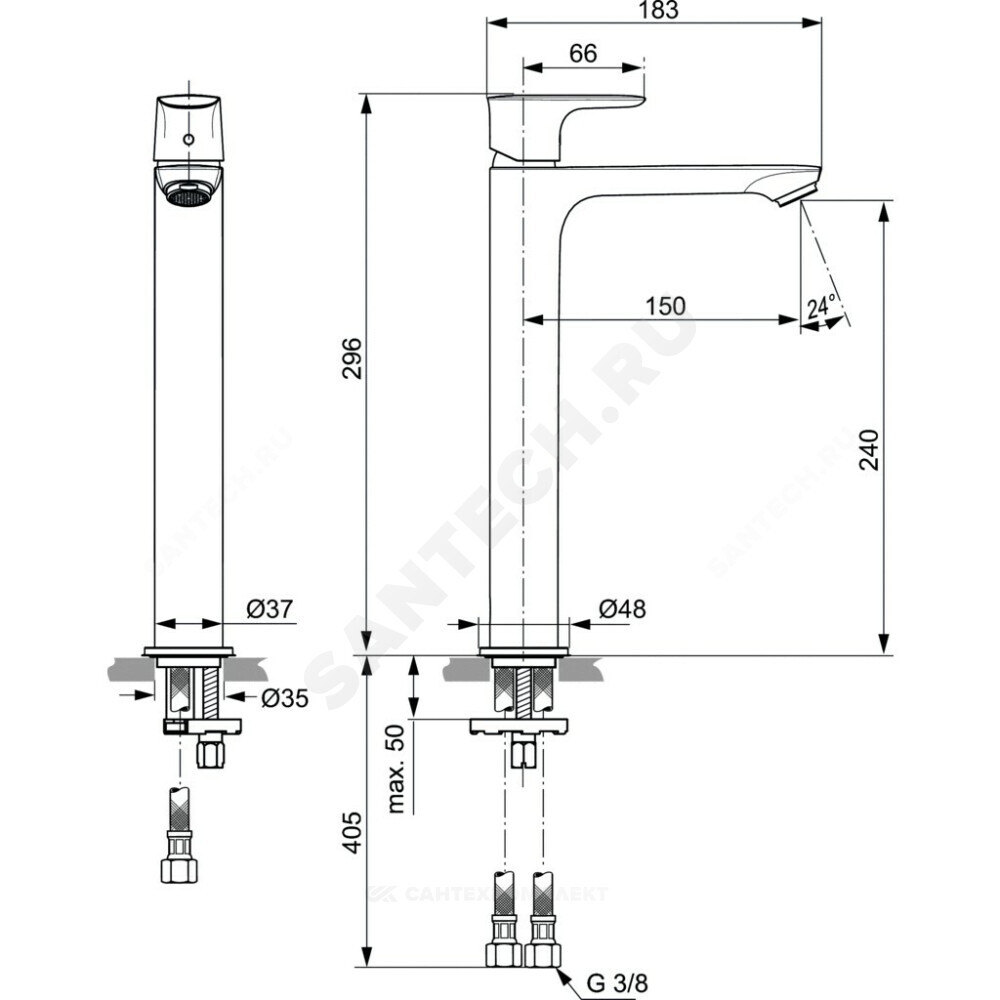 CONNECT AIR Vessel Смеситель для раковины, тонкий корпус 36 мм система монтажа EASY-FIX (облегченный монтаж) аэратор Perlator с ограничением потока 5 л/мин. керамический картридж 25 мм без функции HWTC, без функции CLICK гибкая подводка PEX G3/8" 400 мм без донного клапана