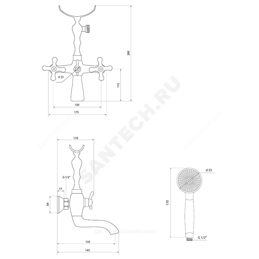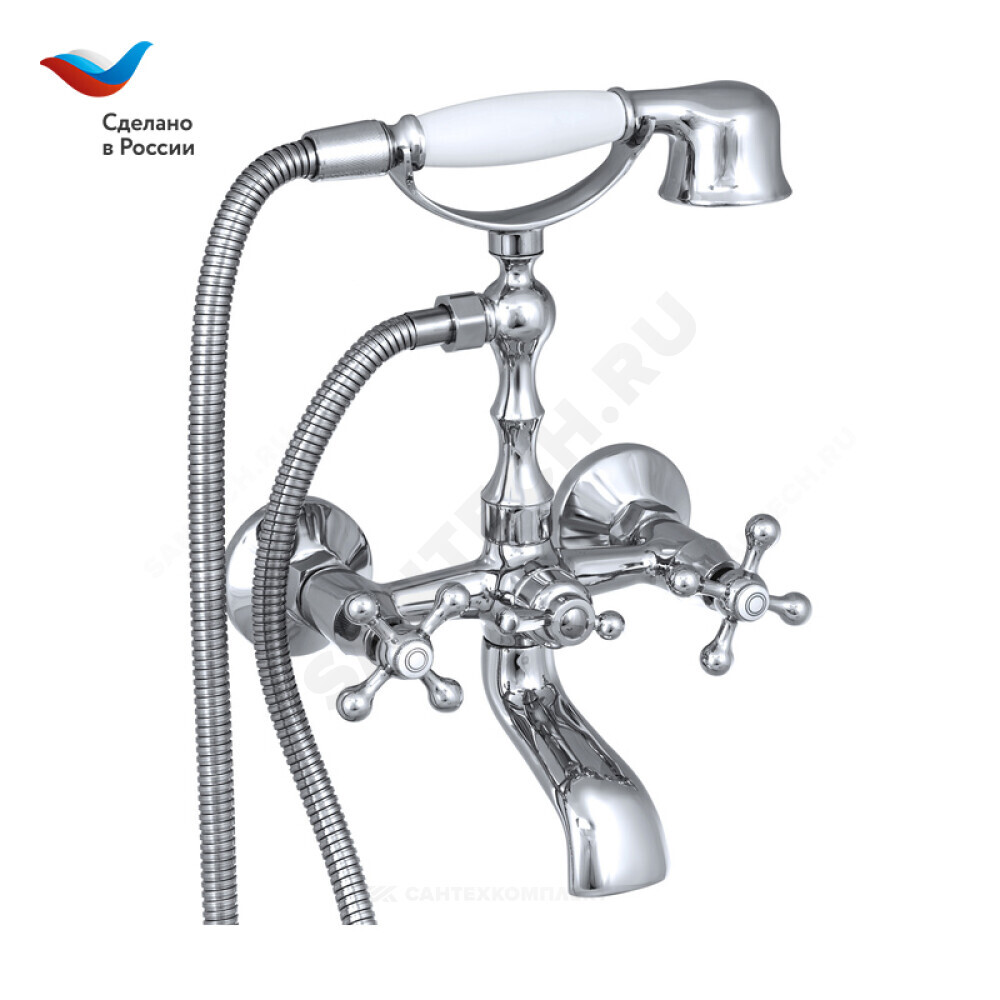 корпус смесителя, излив в сборе, шланг для душа, лейка для душа, держатель для лейки (стойка-телефончик), держатель для лейки настенный, крепежный комплект смесителя к стене (эксцентрики - 2 шт., отражатели - 2 шт., уплотнительные прокладки - 2 шт.), упаковка, паспорт