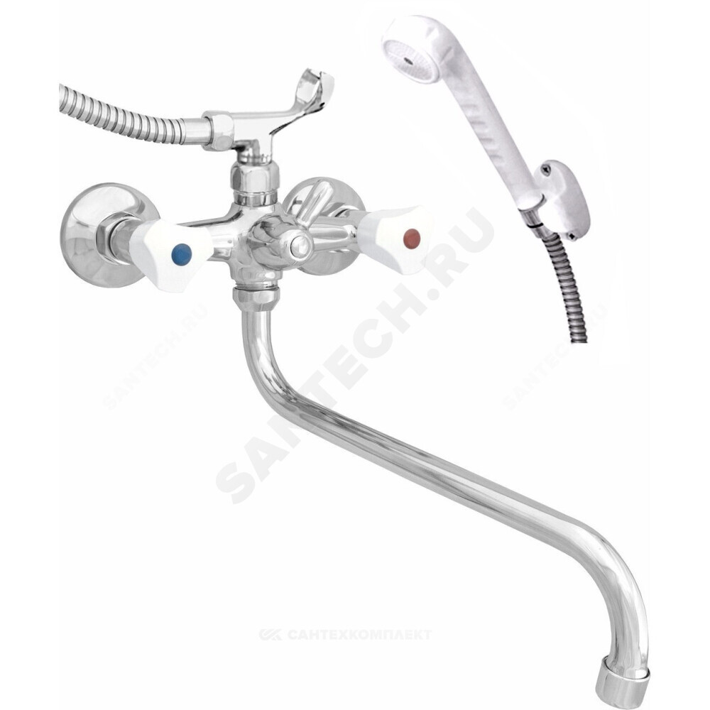 Смеситель общий для ванны и умывальника двухрукояточный с подводками в раздельных отверстиях настенный с душевой сеткой на гибком шланге