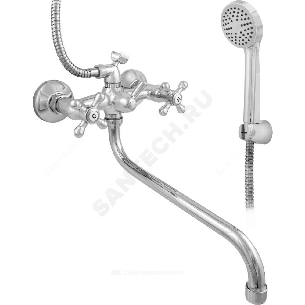 Смеситель общий для ванны и умывальника двухрукояточный с подводками в раздельных отверстиях настенный с душевой сеткой на гибком шланге