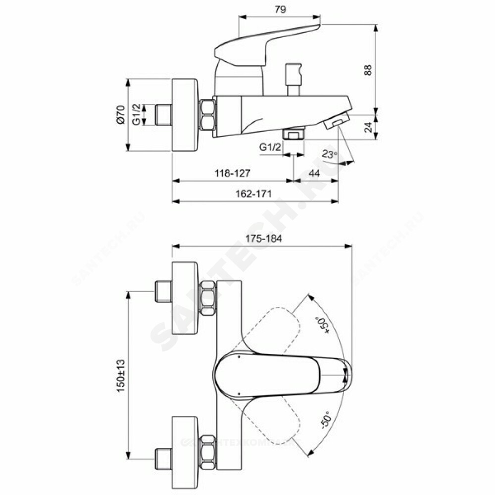 CERAFLEX Настенный однорычажный смеситель для ванны/душа монтаж на стандартных эксцентриках (в комплекте: эксцентрики, металлические отражатели, уплотнительные прокладки) литой излив аэратор Perlator керамический картридж IS 40 мм, с функцией HWTC (ограничение максимальной температуры горячей воды), с функцией CLICK (ограничение потока воды) металлическая рукоятка с индикаторами горячей / холодной воды автоматическое переключение ванна/душ обратный клапан