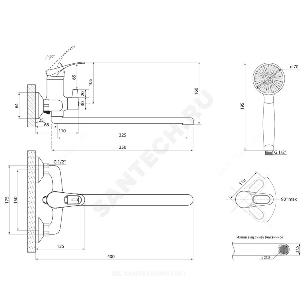 корпус смесителя, излив в сборе с аэратором, шланг для душа, лейка для душа, держатель для лейки настенный, крепежный комплект смесителя к стене (эксцентрики - 2 шт., отражатели - 2 шт., уплотнительные прокладки - 2 шт.), упаковка, паспорт