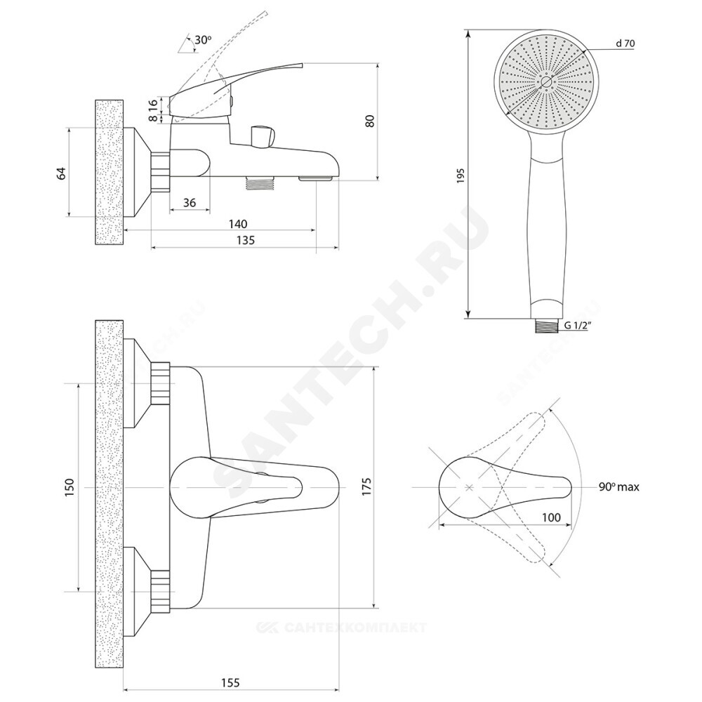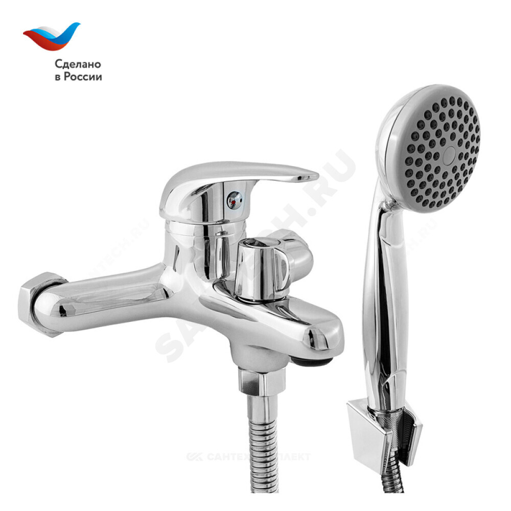 смеситель в сборе, шланг для душа, лейка для душа, держатель для лейки настенный, крепежный комплект смесителя к стене (эксцентрики - 2 шт., отражатели - 2 шт., уплотнительные прокладки - 2 шт.), упаковка, паспорт