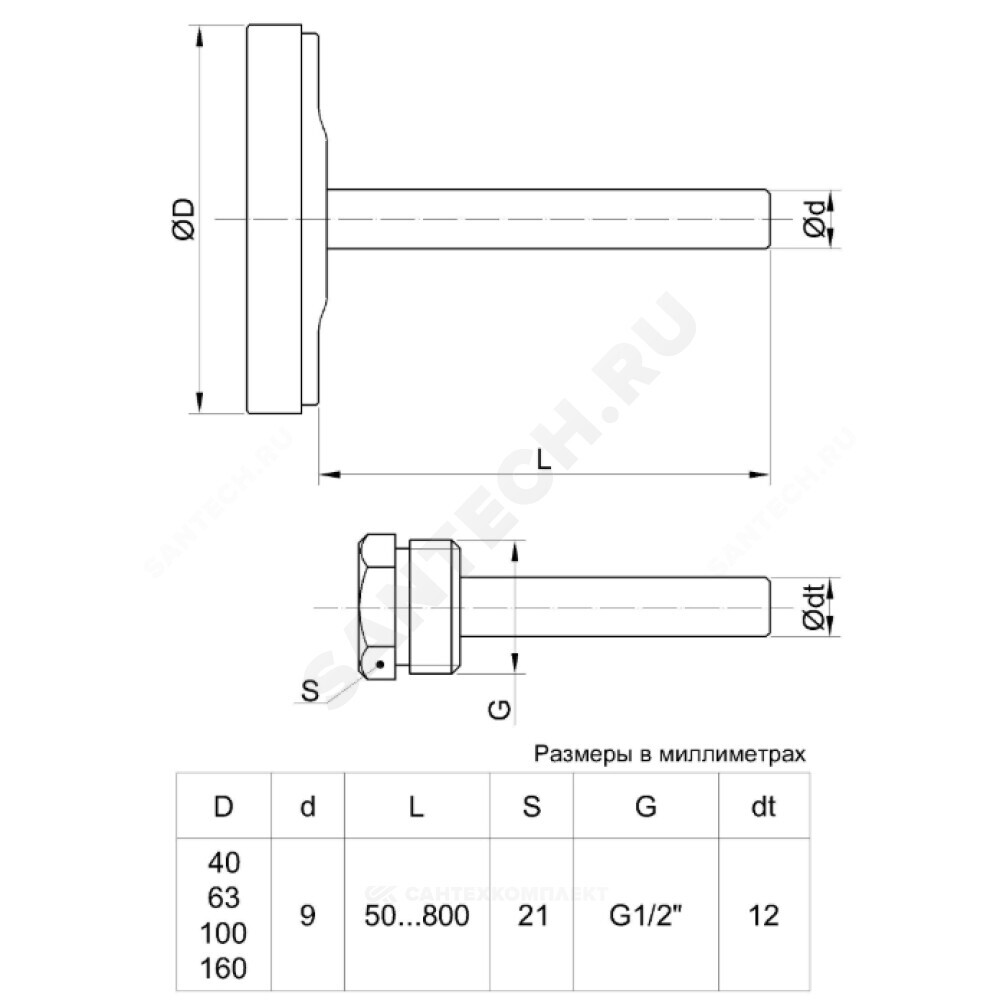 Съемная защитная гильза из латуни (на давление 6 бар).