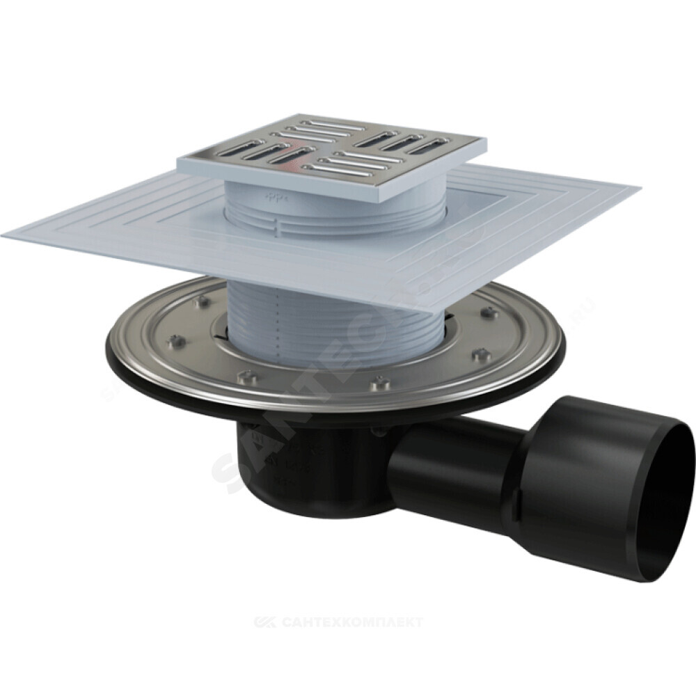 Корпус сливного трапа с боковым подключением к стоку Дн 50/75 Горловина сливного трапа 105х105 мм Решетка из нержавеющей стали Мокрый гидрозатвор Сухой гидрозатвор Фланец из нержавеющей стали + монтажный набор Воротник с 2-х уровневой изоляцией, внутреннее отверстие 105 мм Комплект прокладок