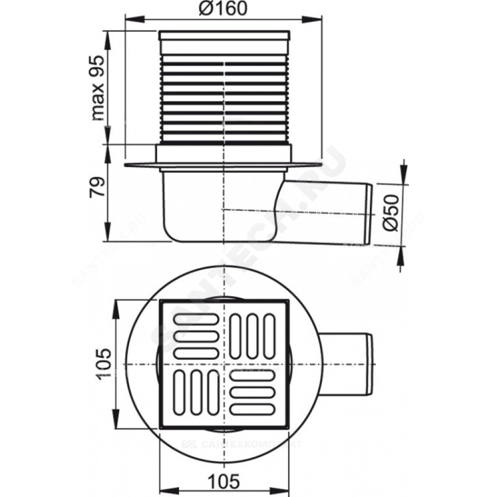 Корпус сливного трапа с боковым подключением к стоку Д 50 Горловина сливного трапа 105х105 мм Решетка из нержавеющей стали Мокрый гидрозатвор Комплект прокладок