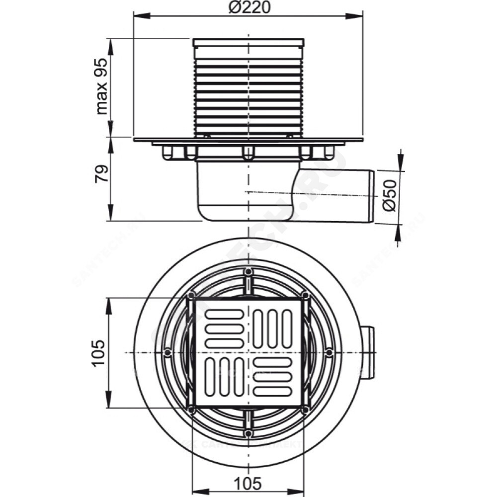 Корпус сливного трапа с боковым подключением к стоку Д 50 Горловина сливного трапа 105х105 мм Решетка из нержавеющей стали Гидрозатвор – комбинированный SMART Комплект прокладок