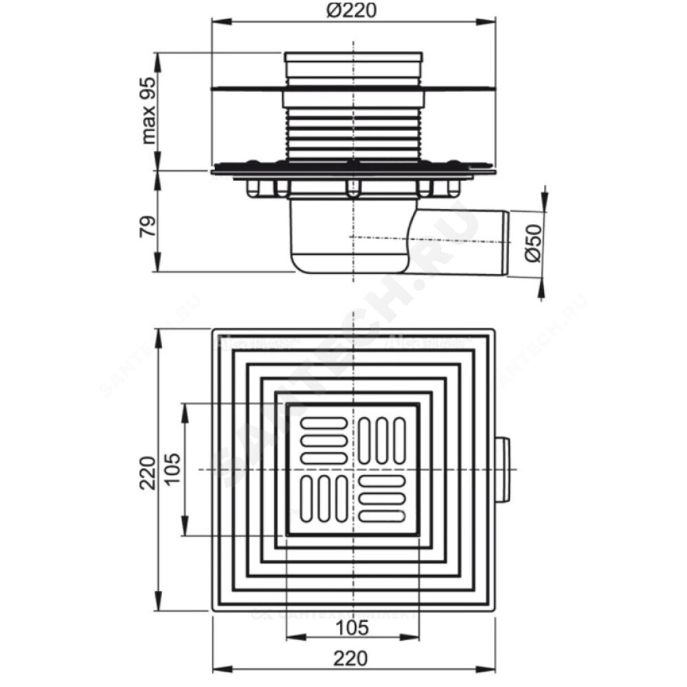 Корпус сливного трапа с боковым подключением к стоку Д 50 Горловина сливного трапа 105х105 мм Решетка из нержавеющей стали Гидрозатвор – комбинированный SMART Фланец из нержавеющей стали + монтажный набор Воротник с 2-х уровневой изоляцией, внутреннее отверстие 105 мм Комплект прокладок