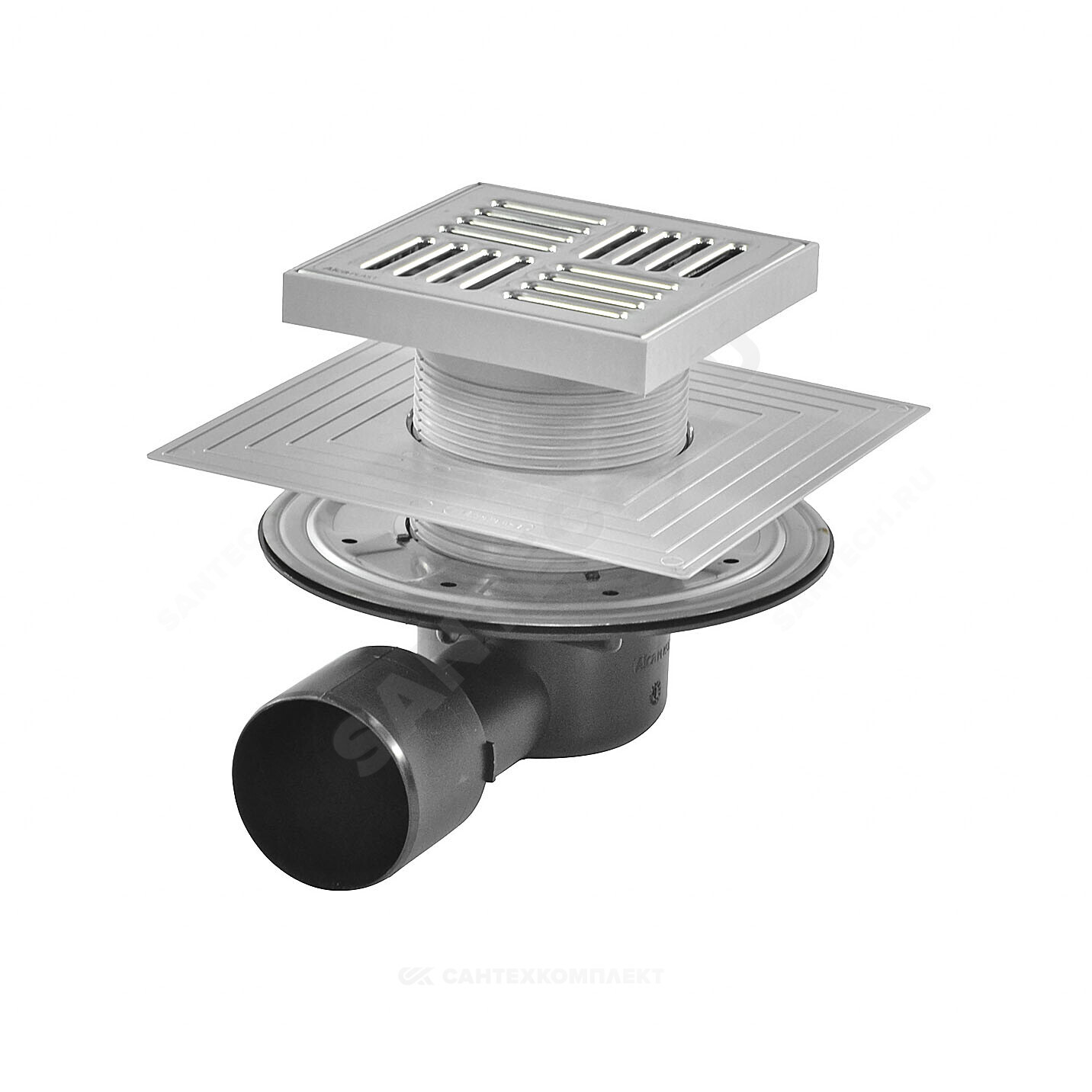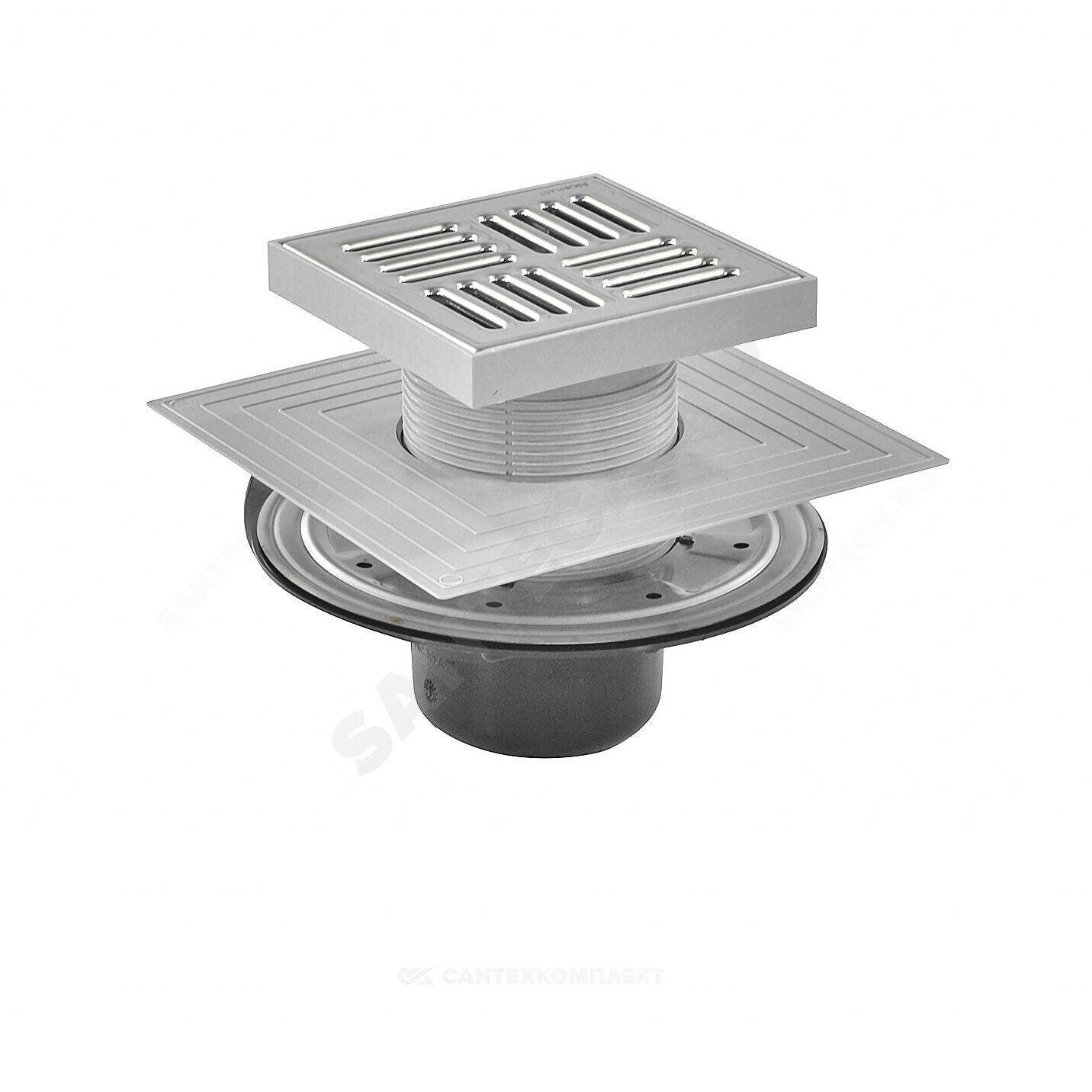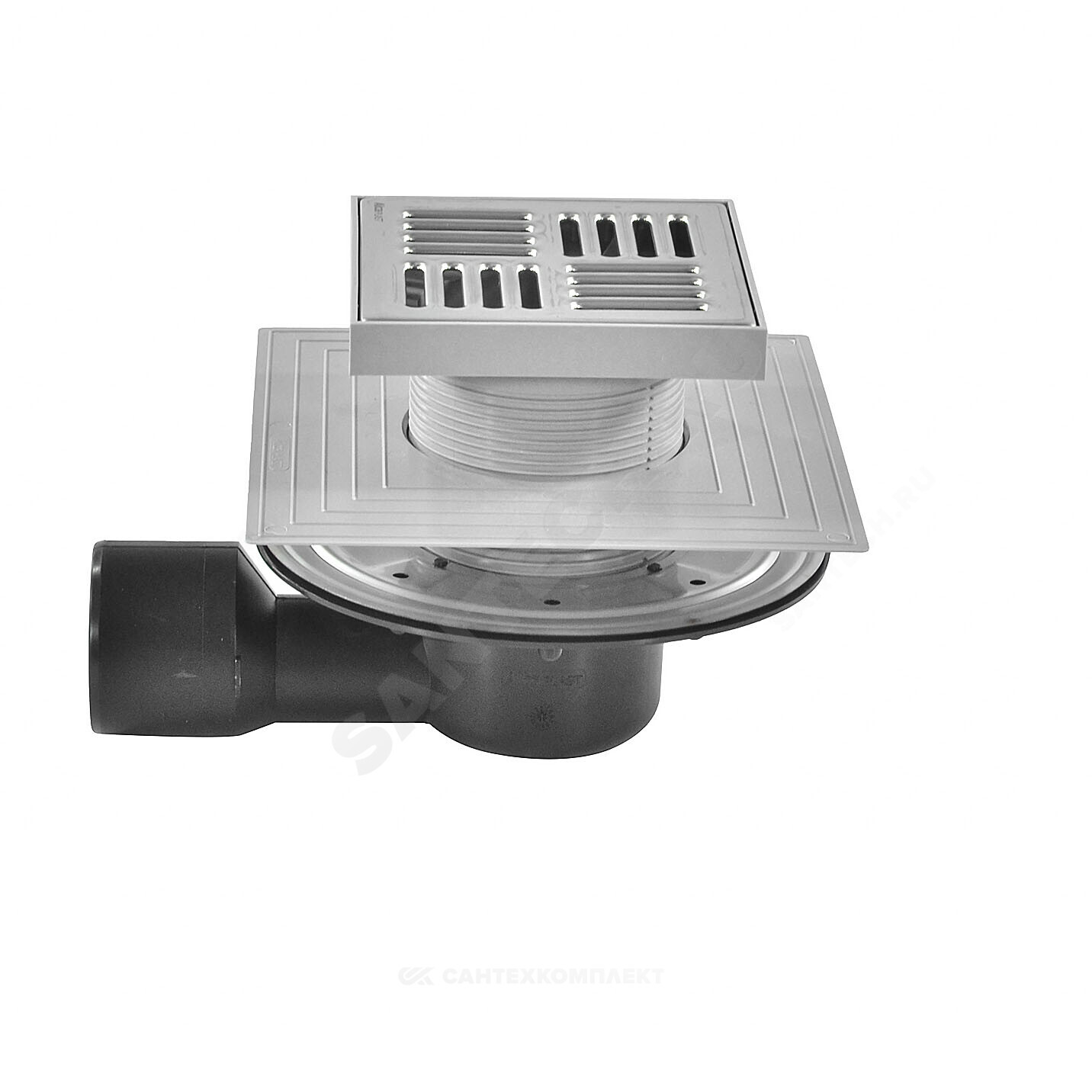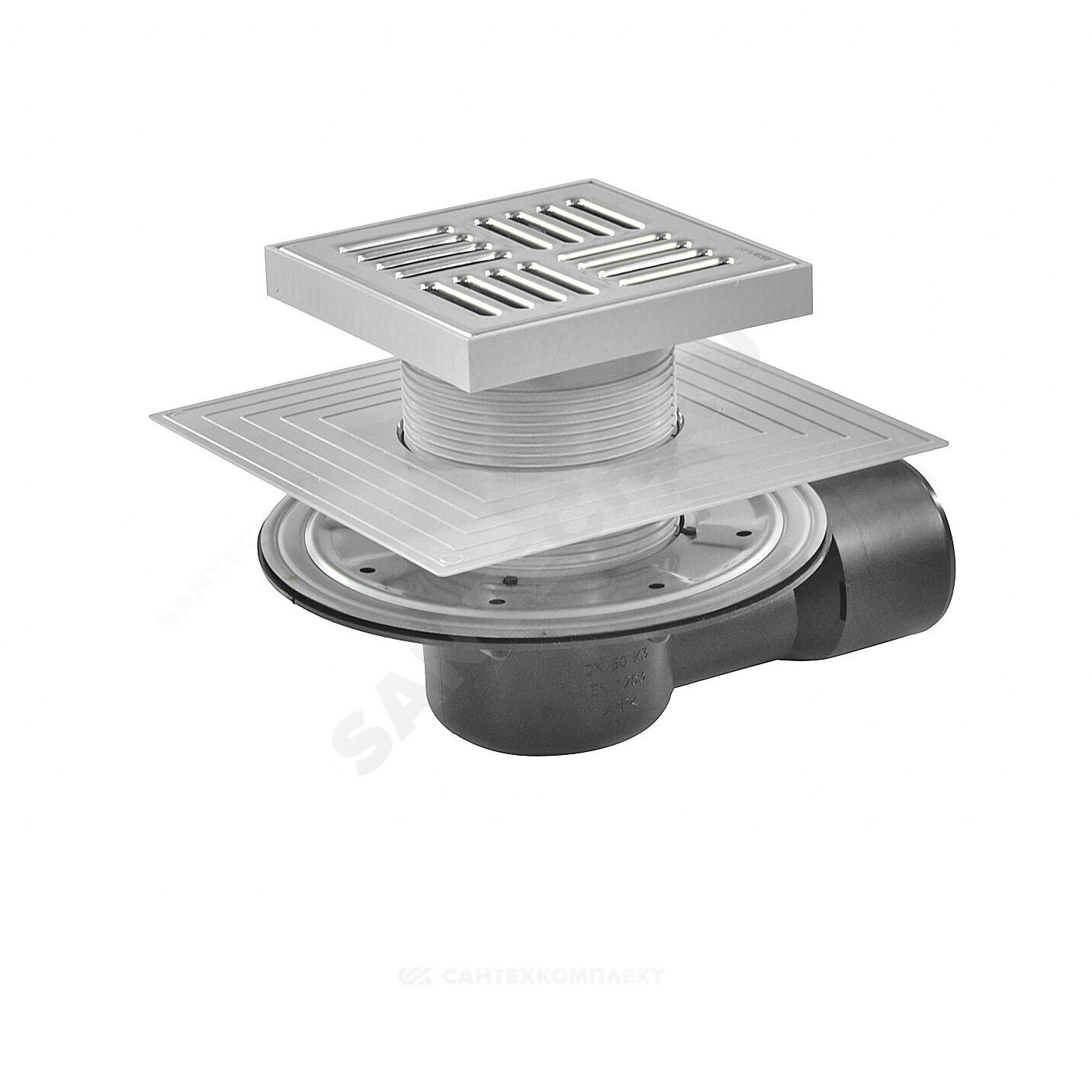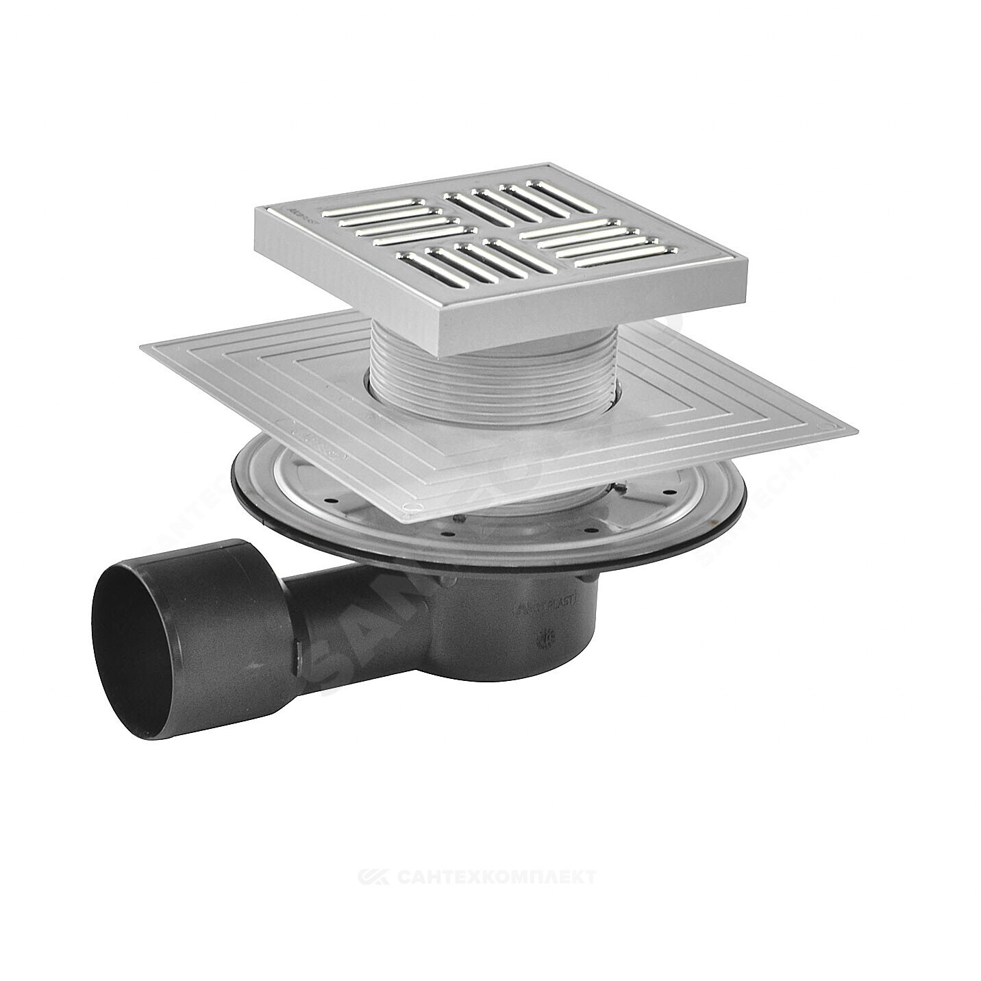 Корпус сливного трапа с боковым подключением к стоку Дн 50/75 Горловина сливного трапа 150х150 мм Решетка из нержавеющей стали Мокрый гидрозатвор Сухой гидрозатвор Фланец из нержавеющей стали + монтажный набор Воротник с 2-х уровневой изоляцией, внутреннее отверстие 105 мм Комплект прокладок