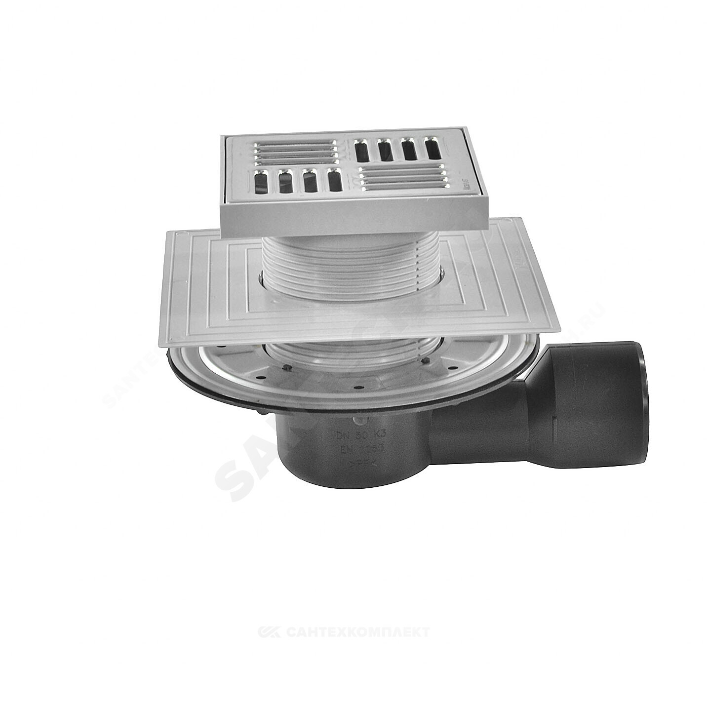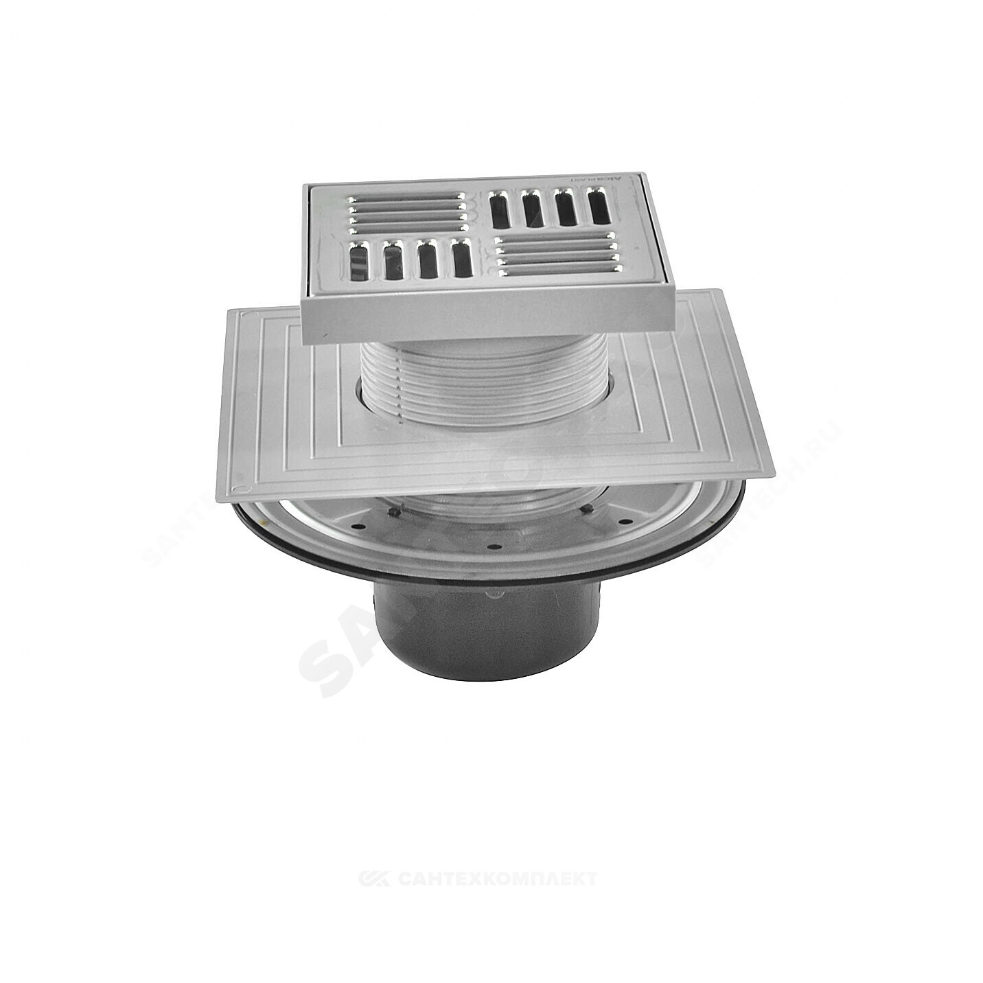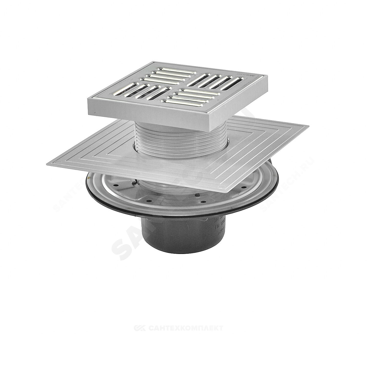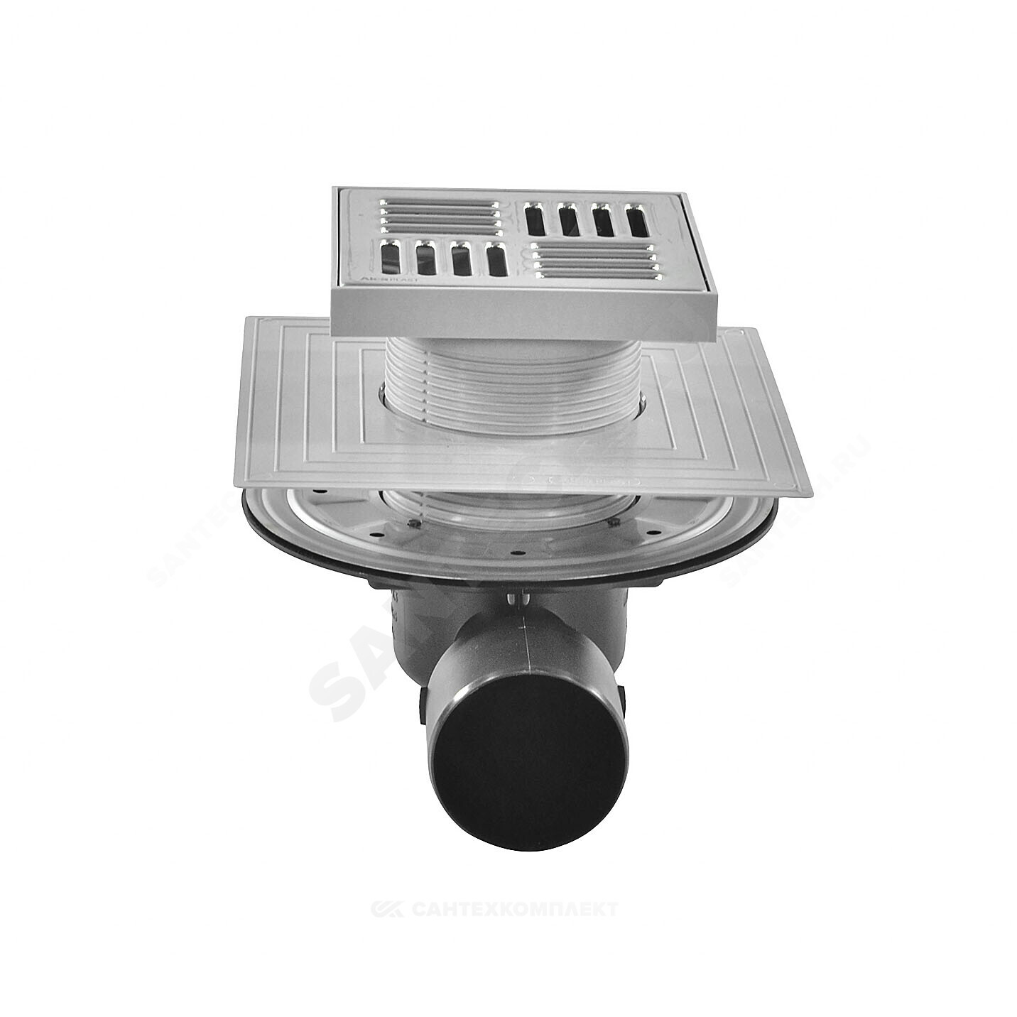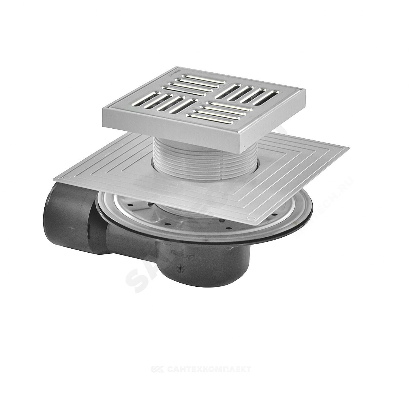 Корпус сливного трапа с боковым подключением к стоку Дн 50/75 Горловина сливного трапа 150х150 мм Решетка из нержавеющей стали Мокрый гидрозатвор Сухой гидрозатвор Фланец из нержавеющей стали + монтажный набор Воротник с 2-х уровневой изоляцией, внутреннее отверстие 105 мм Комплект прокладок