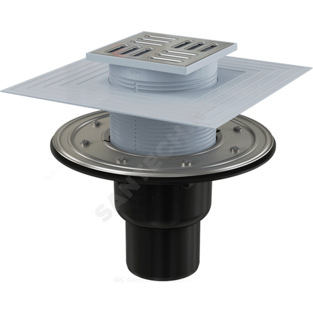 Корпус сливного трапа с прямым подключением к стоку Дн 50/75 Горловина сливного трапа 105х105 мм Решетка из нержавеющей стали Мокрый гидрозатвор Сухой гидрозатвор Фланец из нержавеющей стали + монтажный набор Воротник с 2-х уровневой изоляцией, внутреннее отверстие 105 мм Комплект прокладок