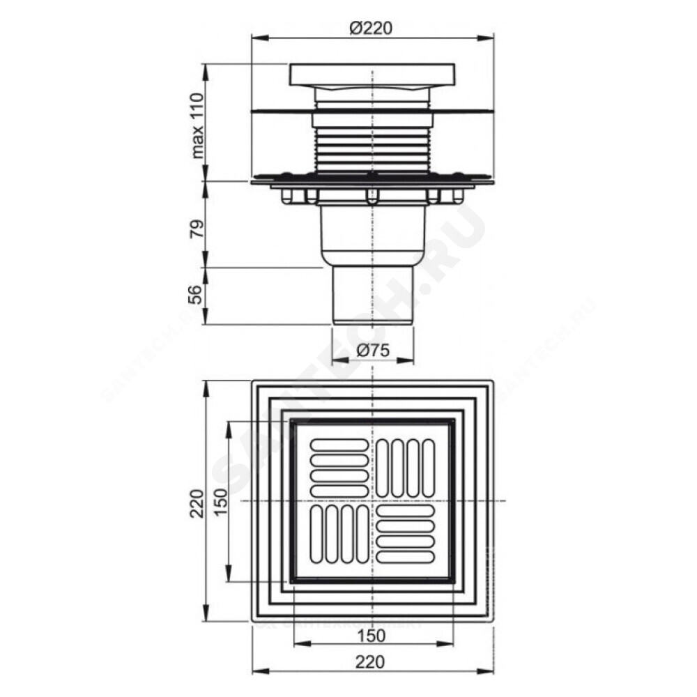 Корпус сливного трапа с прямым подключением к стоку Дн 50/75 Горловина сливного трапа 150х150 мм Решетка из нержавеющей стали Мокрый гидрозатвор Сухой гидрозатвор Фланец из нержавеющей стали + монтажный набор Воротник с 2-х уровневой изоляцией, внутреннее отверстие 105 мм Комплект прокладок