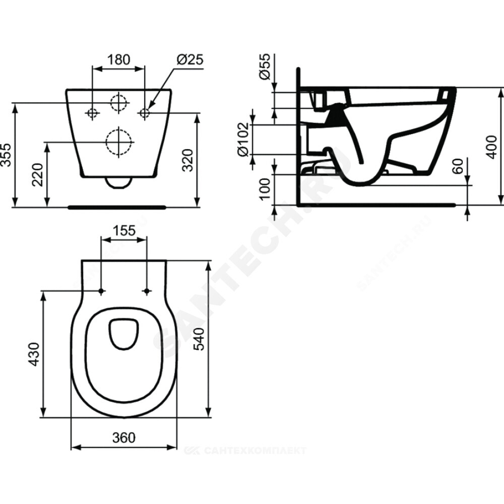 Унитаз подвесной Connect безободковый E822301, сиденье CONNECT тонкое, шарниры металл/пластик E772401
