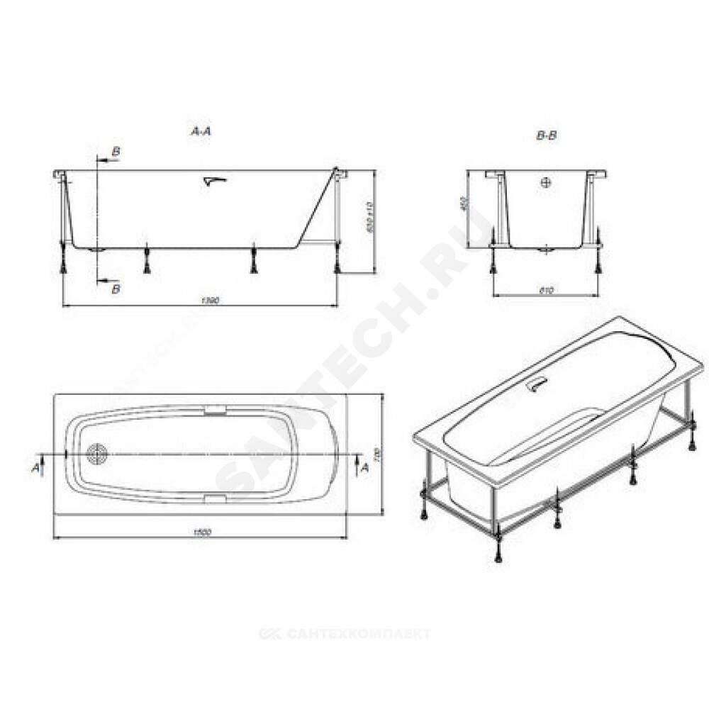Акриловая ванна прямоугольная, глубина 45 см. Монтажный комплект заказывается отдельно. Монтажный комплект (хромированные ручки, каркас, комплект креплений к стене, система слив-перелив полуавтомат)
