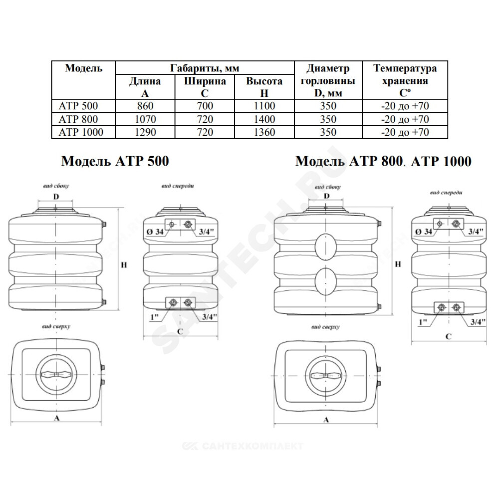 в нижней части емкости для слива / забора жидкостей расположены два отверстия, укомплектованные штуцерами 1" и 3/4". В верхней части – штуцер 3/4" и отверстие 34 мм
